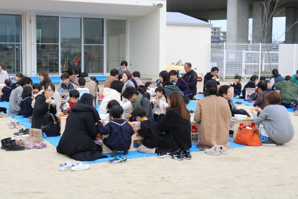 参加保育 今年度の参加保育は、翌日の‟七瀬川たこあげ大会” に向けて、親子で凧作りをしました。 だんご汁やさんで、お店屋さんごっこの百円を払い… 戸外で食事をしました(*^-^*) そして、ちょうどこの日は25年前の阪神淡路大震災と重なった日でした。 防災を意識しながらの園庭での給食体験も経験し、 《備えあれば患いなし》を実感できる日にもなりました。 一覧へ戻る