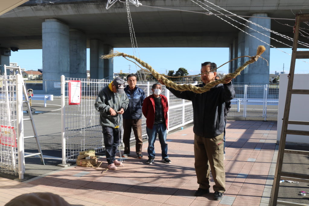 最初はあまり馴染みのないしめ縄に何をするんだろう…とじっと見ていた子ども達でしたが、しめ縄の意味を説明すると「これで神様のお家が出来たね!」