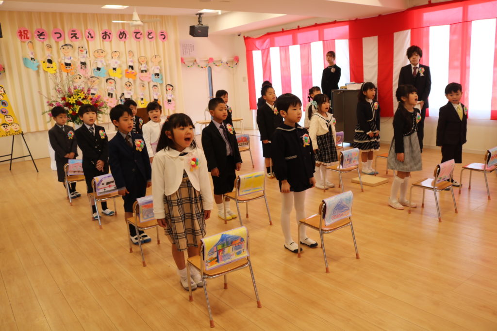 保護者の方や、普段と違い華やかに飾られた会場を前に「緊張する~」と言いながらも、いつもの可愛らしいにこやかな笑顔を見せてくれる子どもたちでした。今年度の卒園児さんは、平成30年度の開園時に0歳児(ひかり組)に入園した子どもたちで、式が始まると背筋がピンと伸び、堂々と卒園証書を受け取る姿に6年間の成長を感じ、これまでの思い出が蘇り、感慨深かったです。