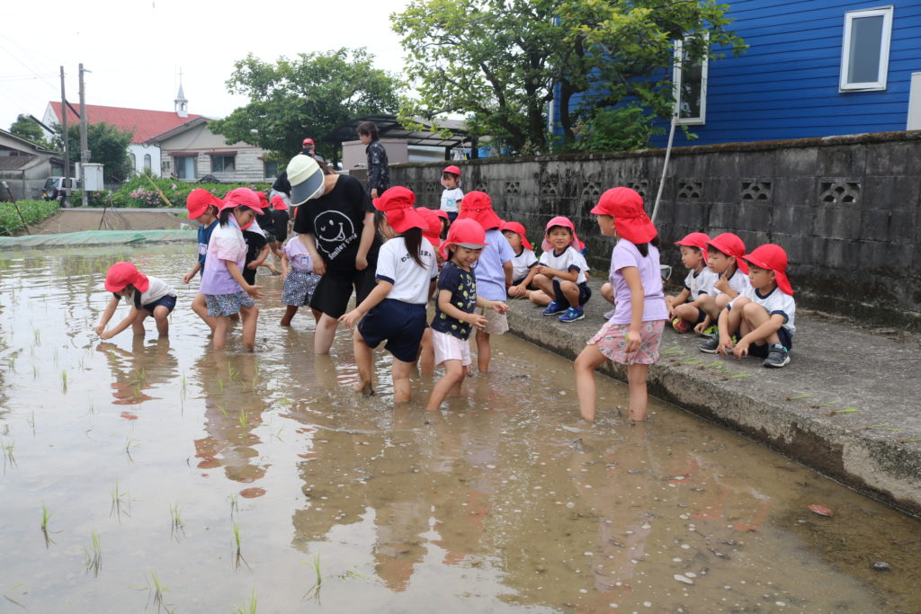 田んぼの中にいる虫を見つけては捕まえたり、保育者に虫の名前を尋ねたりと、自然にも触れられた体験でした。