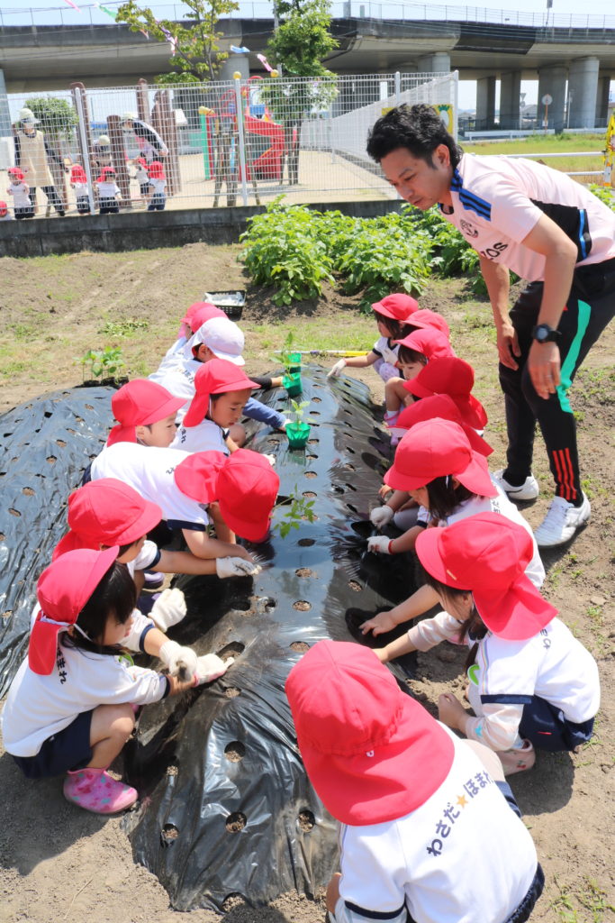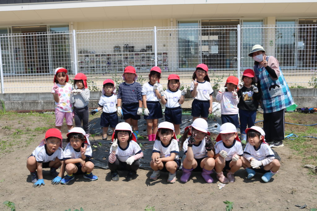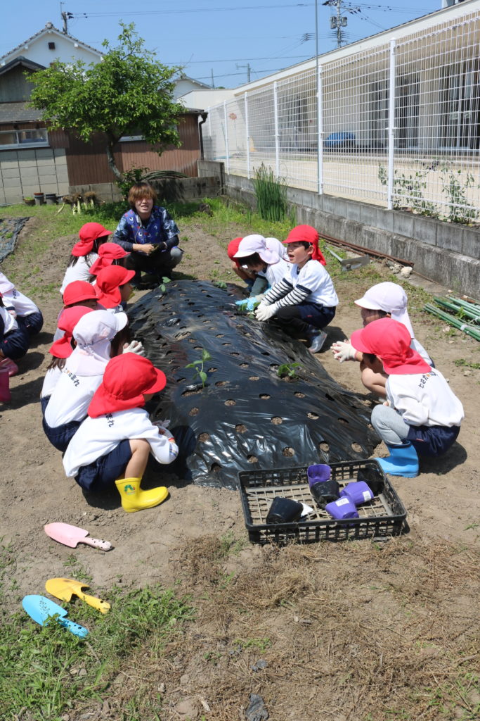 苗を植えたら土の布団を被せるんだよと、友だち同士で教え合いながら優しく土を苗に被せてあげていました。