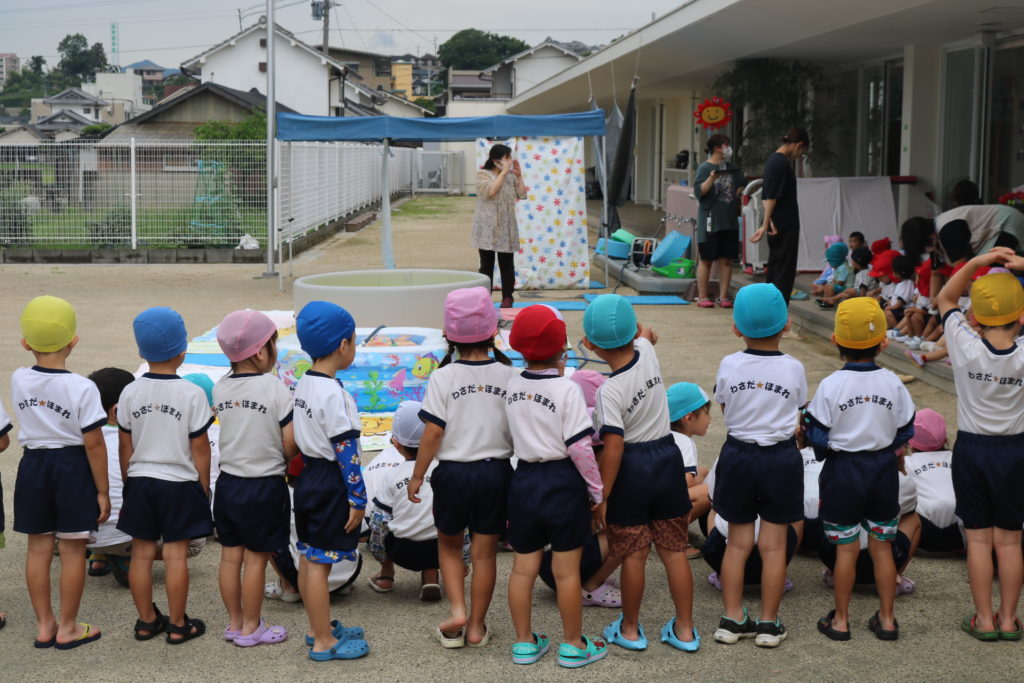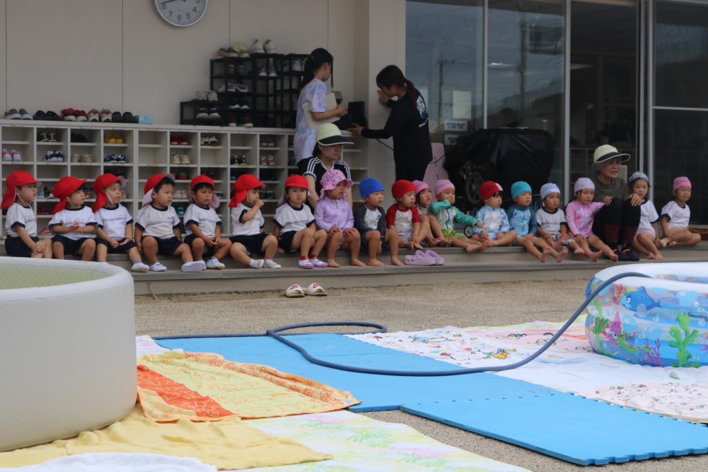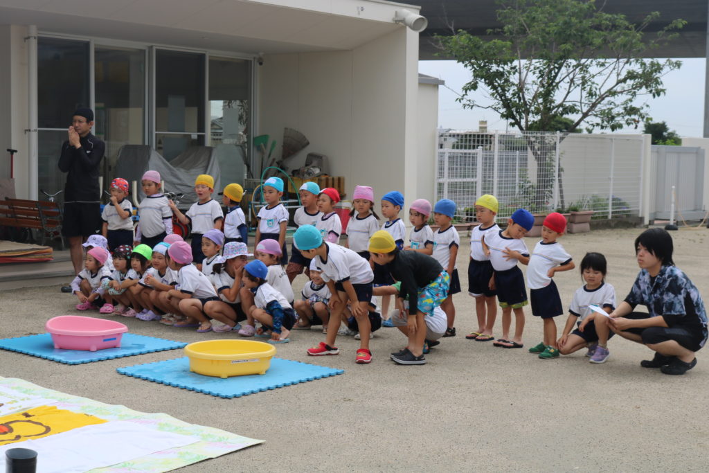 夏の間安全に水遊びができるよう、遊び方の話を聞いたり保育者による寸劇を見たりして、しっかり予習のできた子どもたちでした。みんなで手を合わせて「おねがいします」と可愛らしくお願いする様子に、微笑ましく感じました。