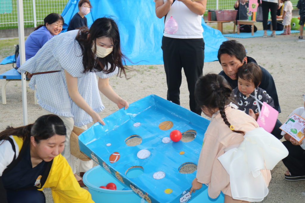 | ゲームは、ひもひき・たまおとし・的当て・よーよー釣り・スライムづくり・ワニワニパニックの6店舗があり、どの店舗も大盛況でした。親子で協力しながら遊ぶところでは、子どもと目線を合わせながら子どものペースに合わせたり、子どもが取り組むゲームでは側で盛り上げ応援してくれたりする、保護者の方のあたたかい愛情を感じることが出来ました。 |