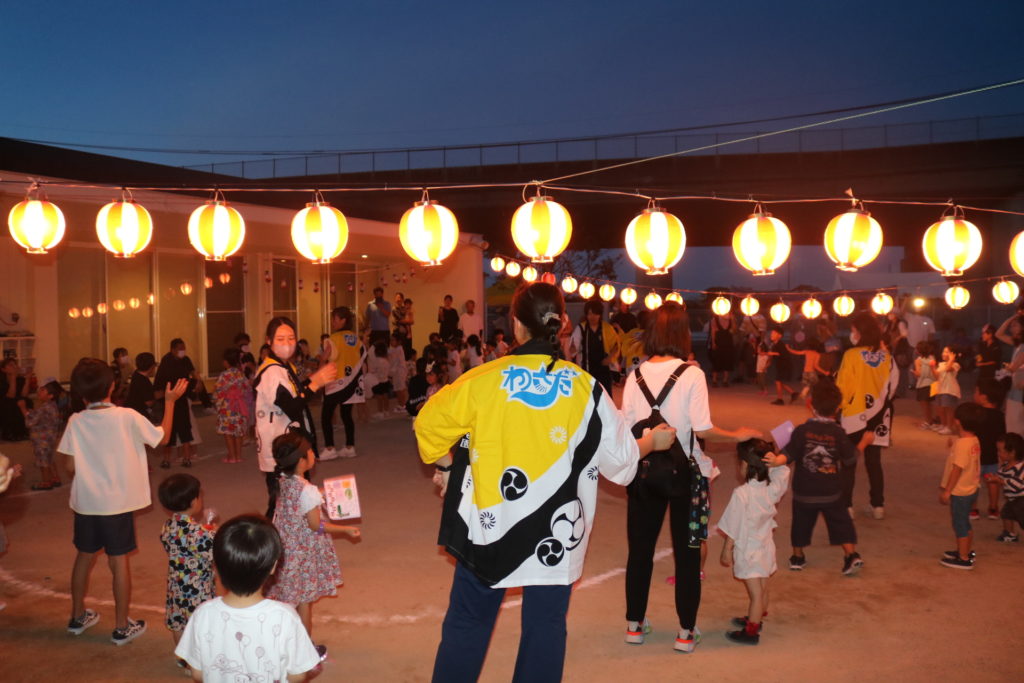 | 昨年までは日中に子どもたちと一緒に夏祭りとして楽しんできましたが、今年は4年ぶりに夕涼み会を行い、保護者の方も一緒に楽しみました。 |
