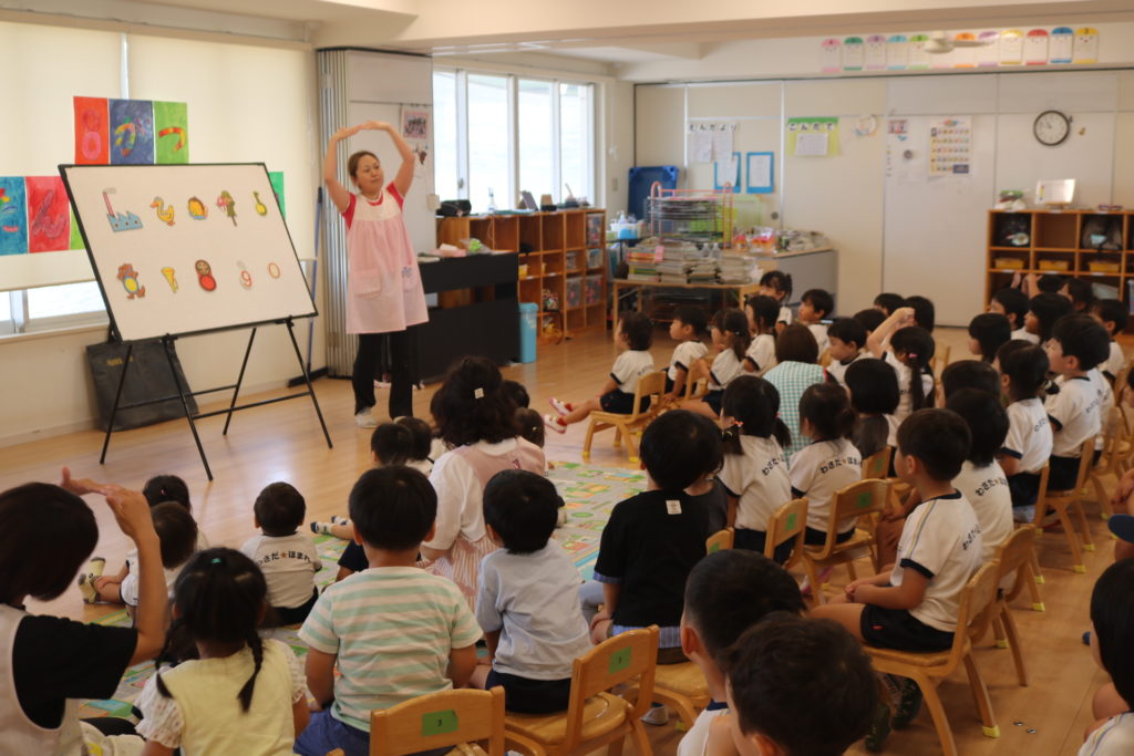 保育者からの出し物では“すうじのうた”“とんでったばなな”“スイミー”のパネルシアターを見ました。子どもたちの毎日歌っている歌で、口ずさみながらもパネルに集中して見入っていた子どもたちでした。