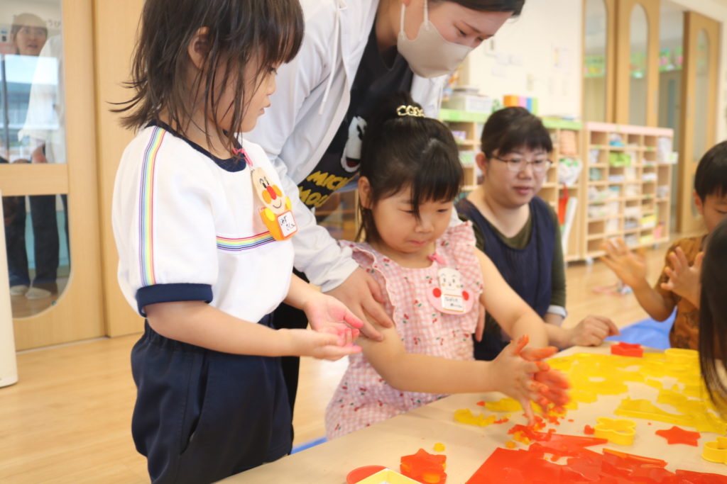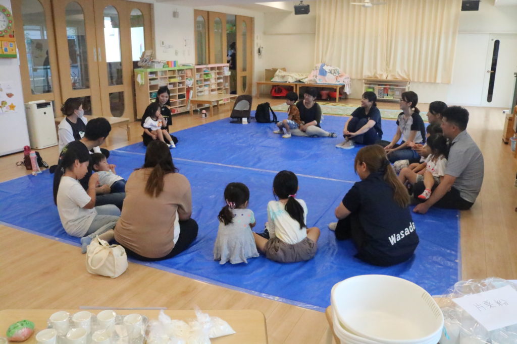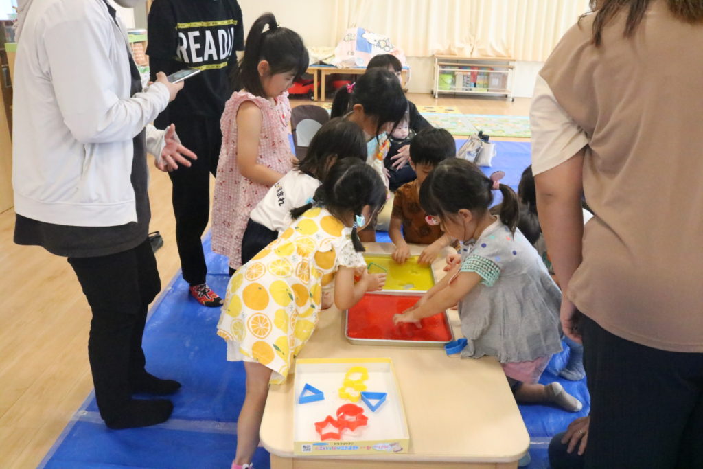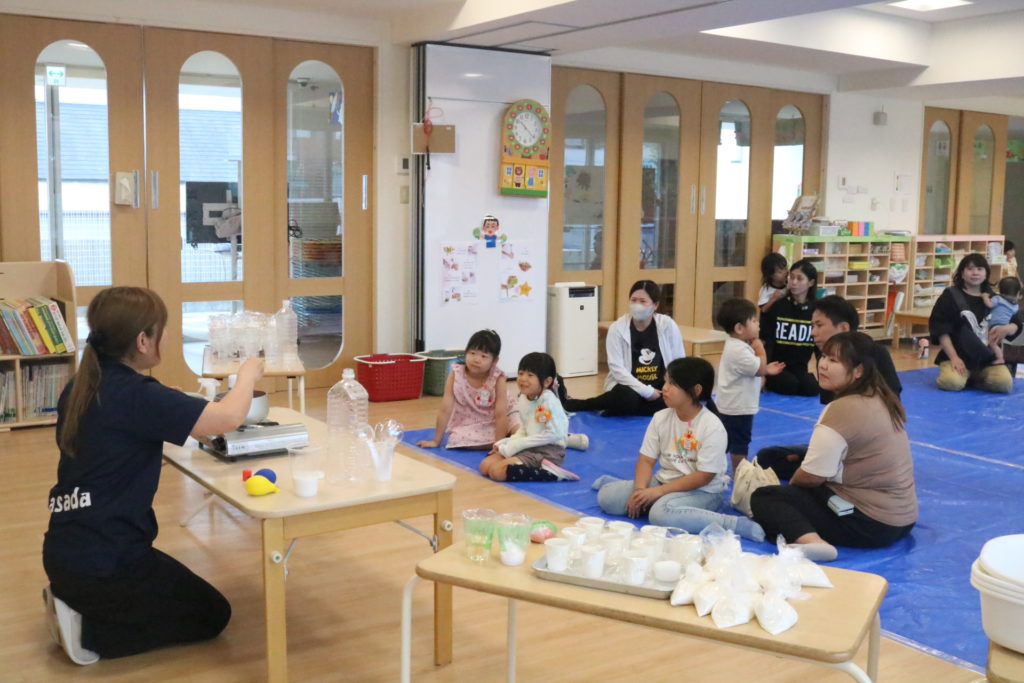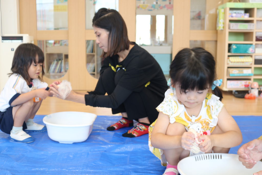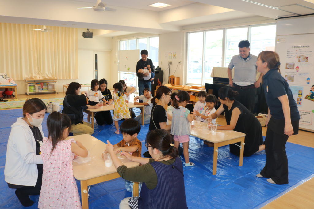 家庭学級「ひだまり」 今回の家庭学級「ひだまり」では、親子で感触遊びを楽しもうです。 用意したのは、スライム、小麦粉粘土、寒天あそび、片栗粉粘土、シェイビングスライムです。 実際に親子で作り、プルプルした感触、ドロドロした感触、プニュプニュした感触、いろんな感触を感じて楽しんでいました。次回も親子で楽しめる活動を準備していきたいと思います。 一覧へ戻る