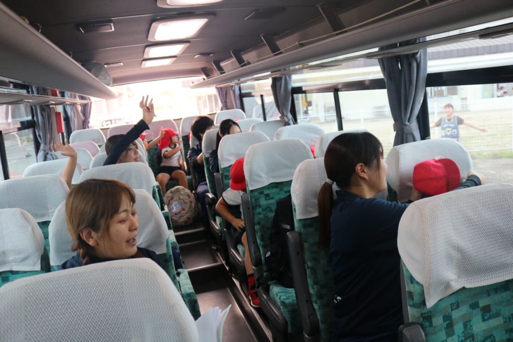 園に残っている職員や、年下のクラスの友だちに見送られ、バスの中から手を振って元気に出発しました。園舎が見えなくなるまで、手を振る子もいましたよ。