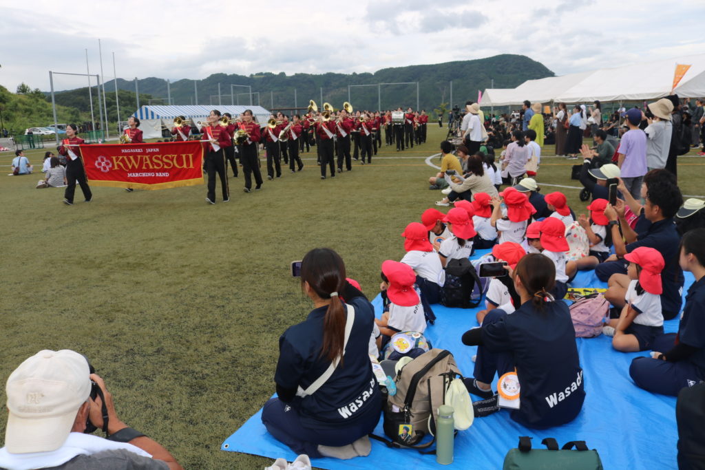 のつはる天空広場では“のつはる音の森フェスティバル”というイベントが行われており、マーチングや太鼓を見学して、その迫力に釘付けになっていた子どもたちでした。これから子どもたちもマーチングをする機会がありますが、姿勢の良さやお兄さんお姉さんが笑顔で楽しそうに演奏する姿が印象に残ったようで、良い刺激になったようでした。
