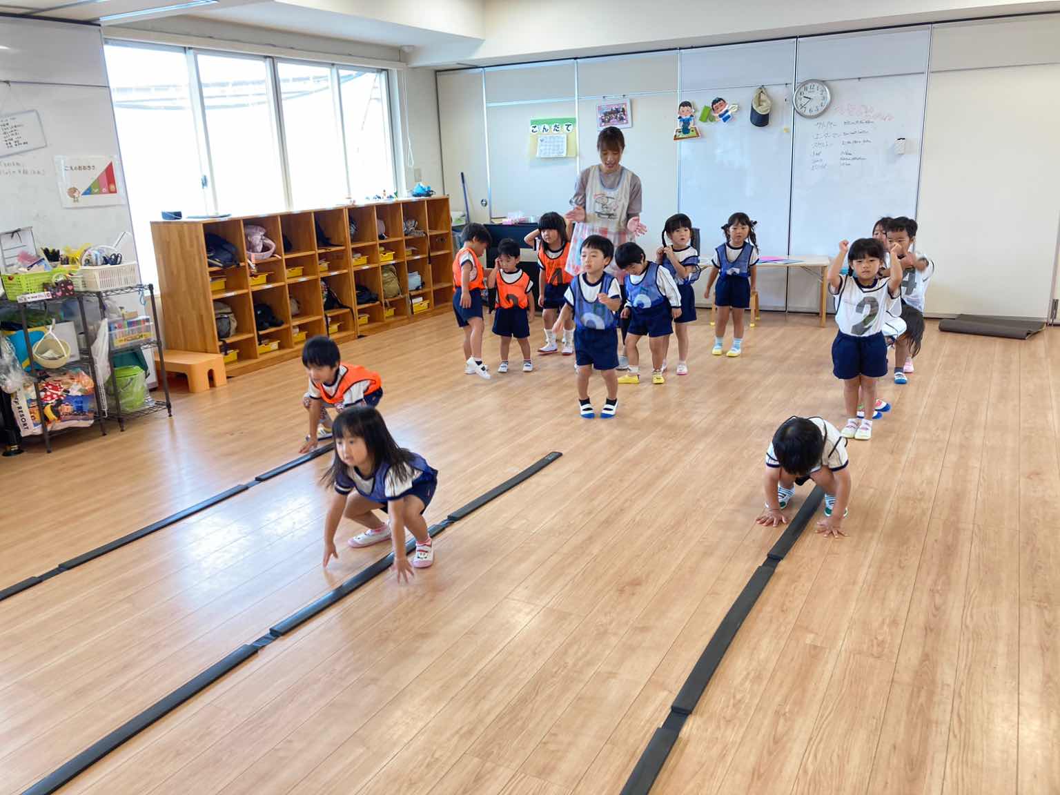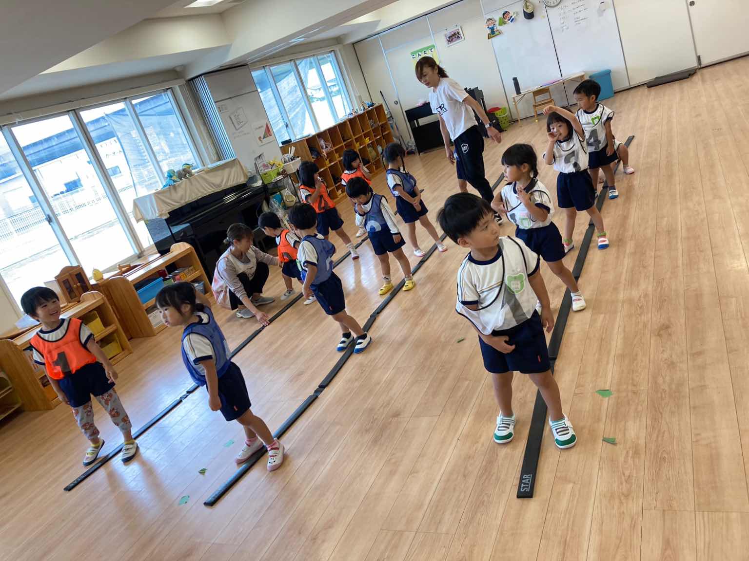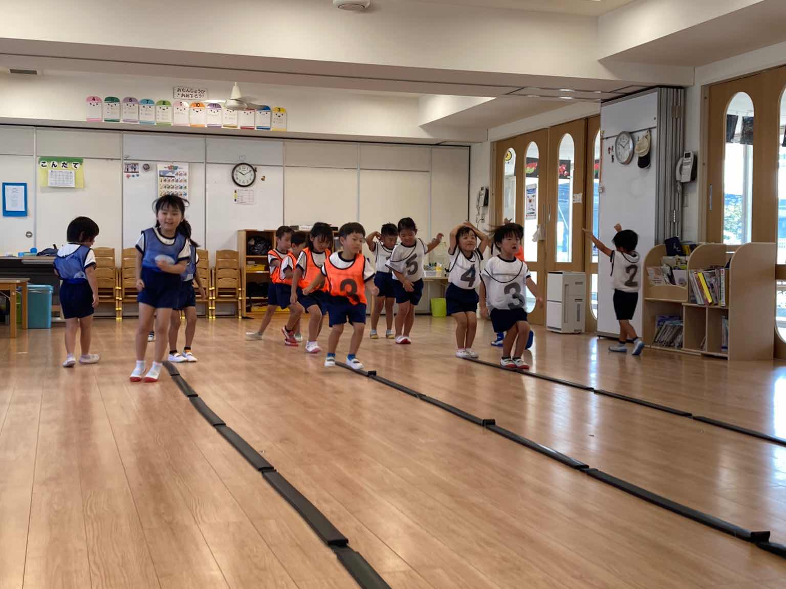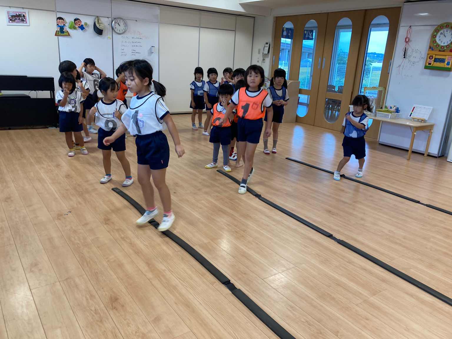 ①ラインは”踏まない” ②曲を”よく聞き速さに合わせる” ③「5.6.せーの!」で出発する ④帰りは端を歩いて戻る という4つのお約束を守りながら取り組んでいます。
