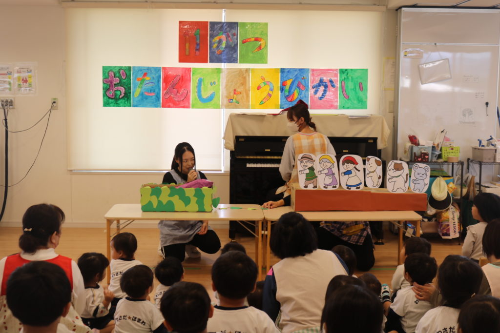 保育者からの出し物は“おおきないも”でした。子どもたちのよく知っている“おおきなかぶ”のお話を芋に変えてペープサートで楽しみました。