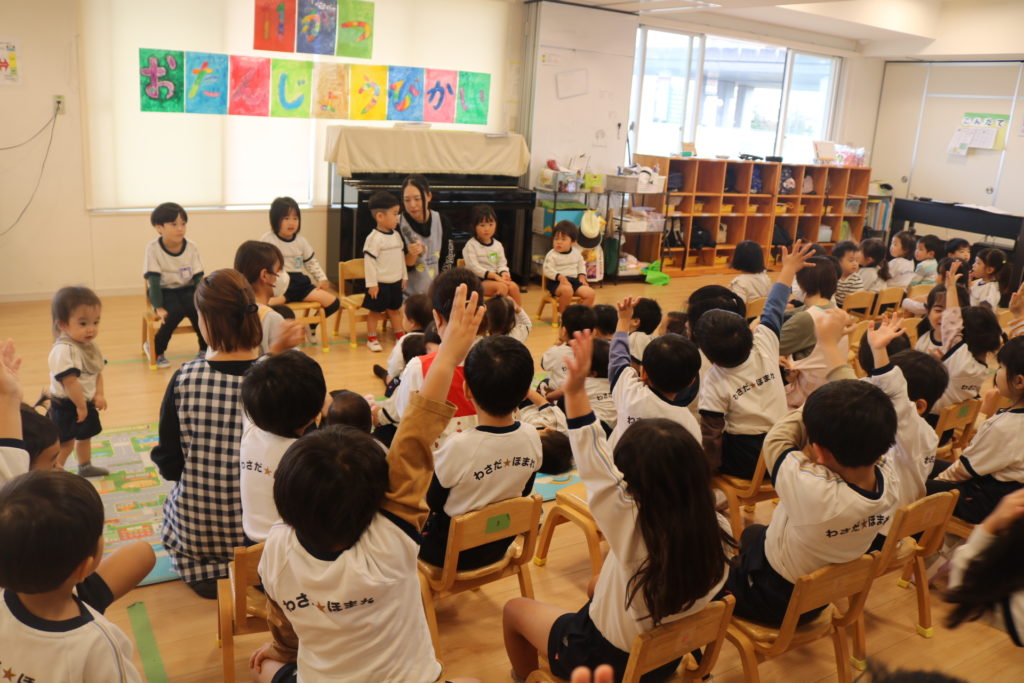 物語が始まる前から、なにか違和感を感じたのか、ザワついていた子どもたち。「おばあさんがおじいさんを引っ張って、おじいさんがカブを引っ張って・・・」と物語が進むにつれて「あ~!これおおきなかぶやん!!」といい反応を示してくれました。
