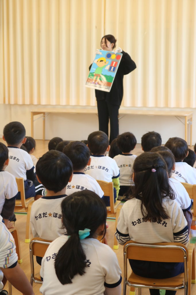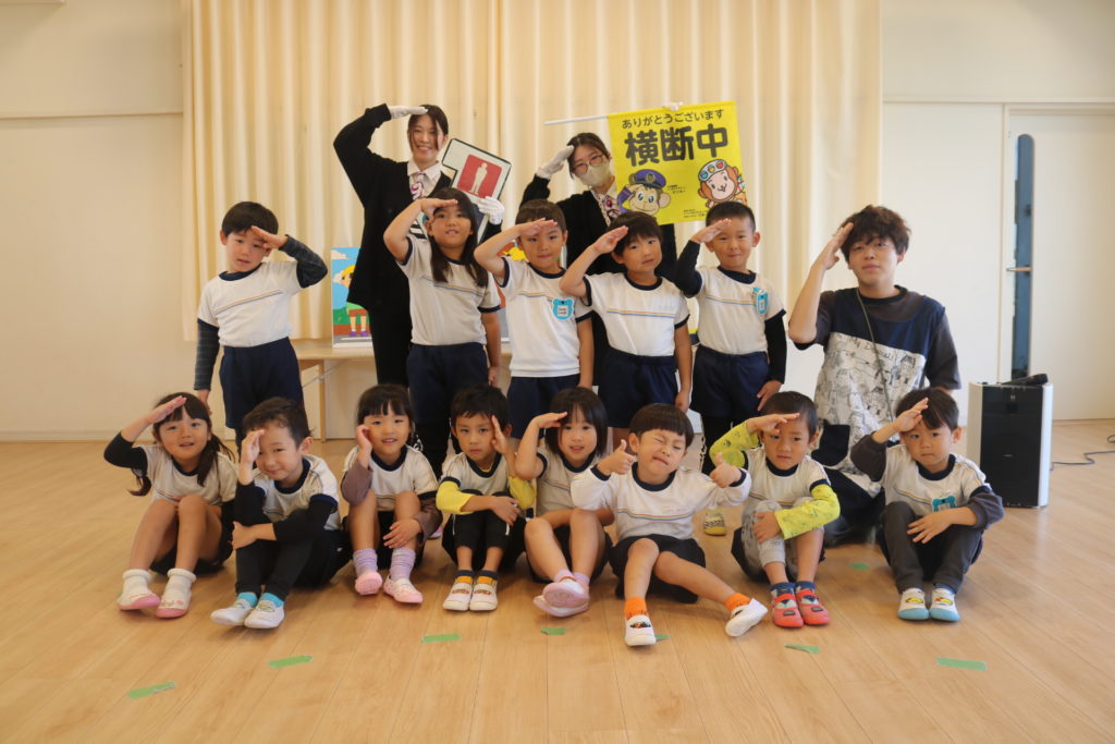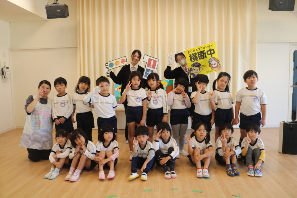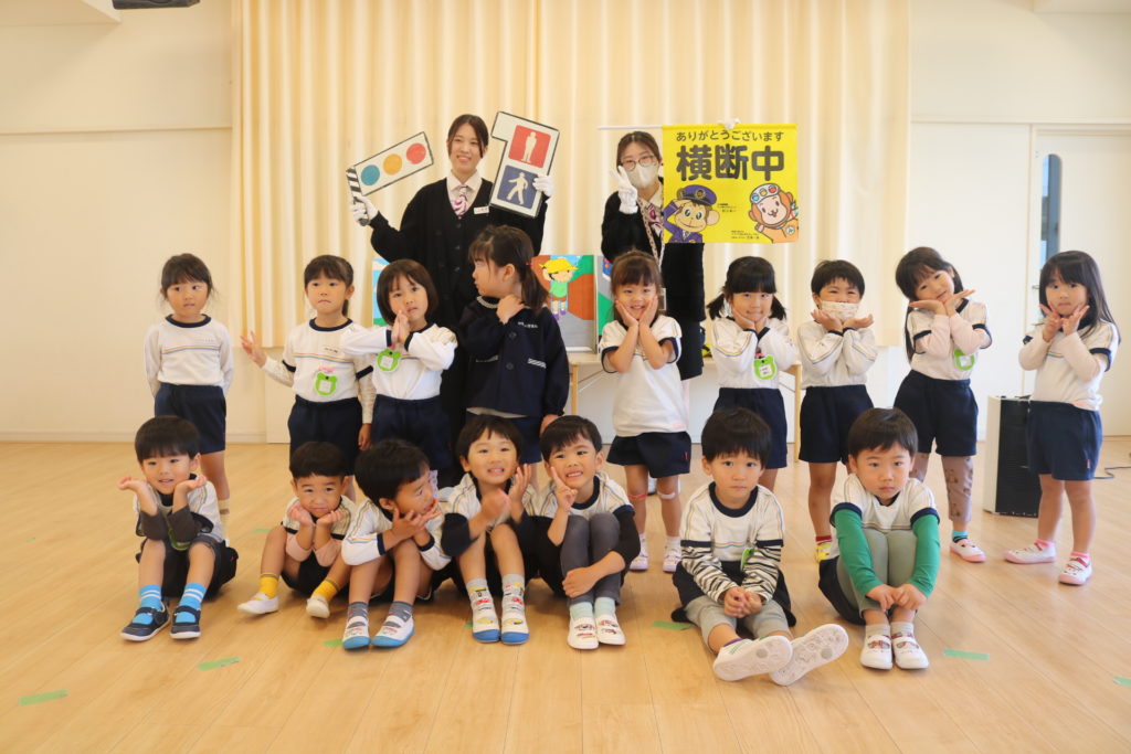 交通課の方から信号機の説明と、渡り方のお話をしていただきました。「青はすすめ・赤はとまれ、では黄色は何でしょう?」と質問され、「注意して止まれ!」と答える子どもたちでした。「黄色は、青から赤に変わるよ!という合図なので、すぐに止まりましょう」と教えていただきました。
