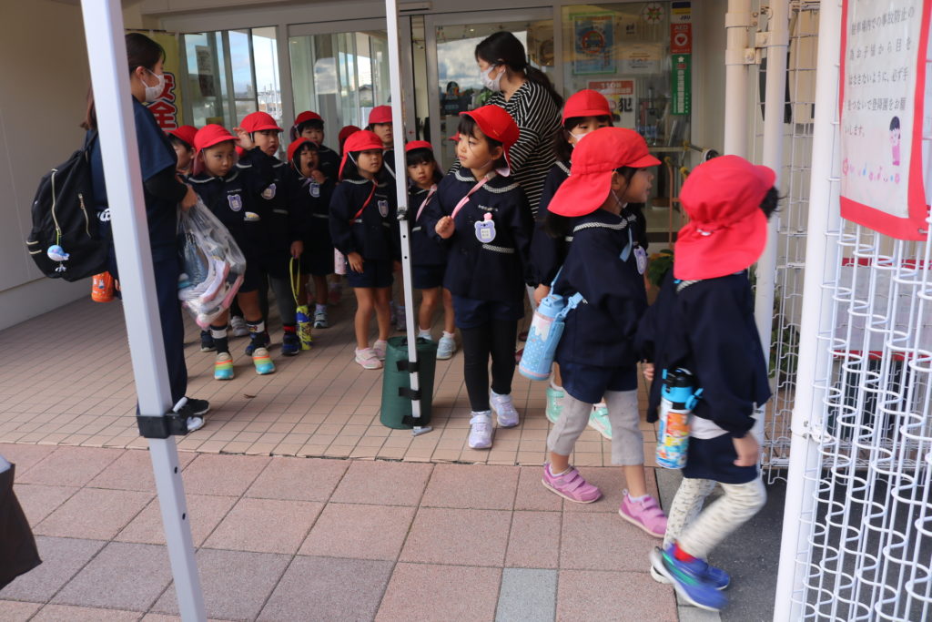 到着すると、こども教育科のお兄さんお姉さんが座る場所まで案内してくれ、隣に座ってお話をしてくれて、優しくあたたかく歓迎してくれました。緊張の面持ちだった子どもたちも、優しいお兄さんお姉さんの笑顔につられ、少しずつ笑顔になっていきました。