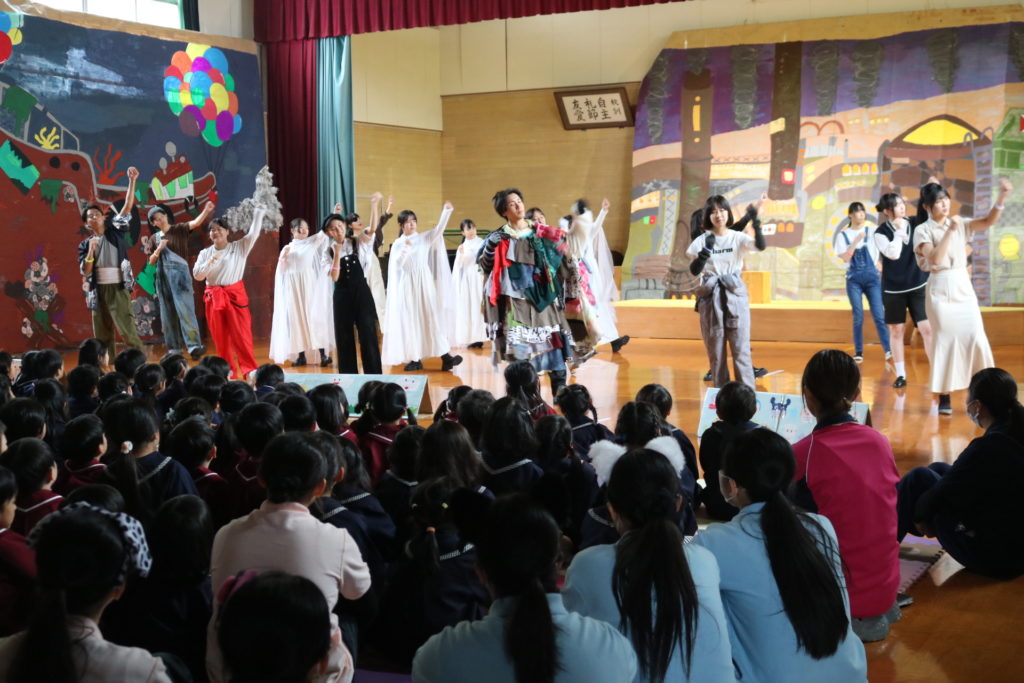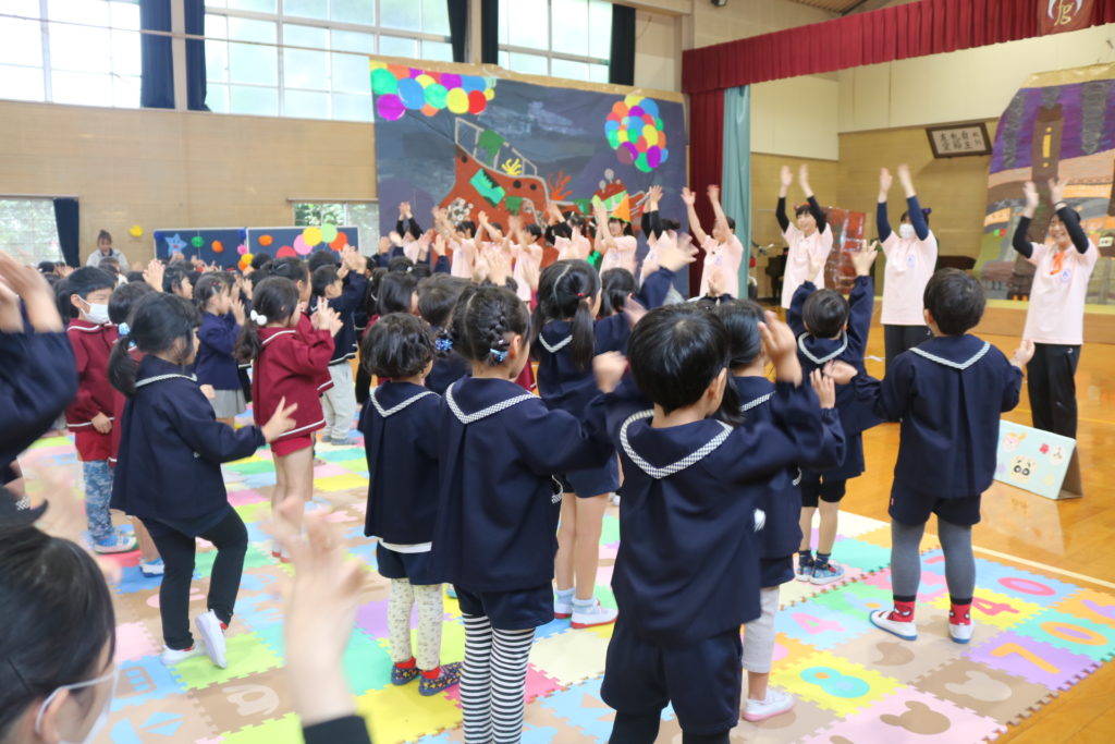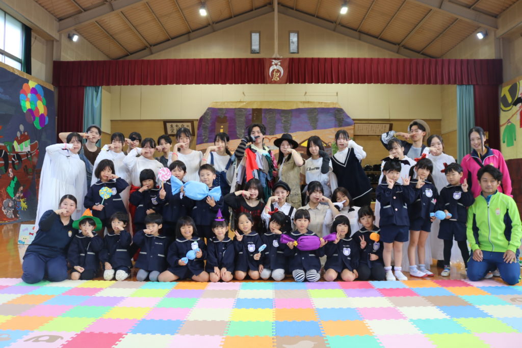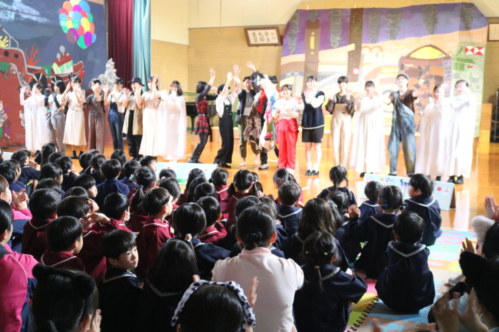 最後には、こども教育科の3年生による「えんとつ町のプぺル」のミュージカルを観ました。プぺルとルビッチの友情や、自分の信じたことを信じぬくルビッチの姿に、釘付けになり真剣な表情で観ていた子どもたちでした。劇中のダンスの簡単な振り付けをその場で教えてもらい、一緒に踊り参加できて嬉しそうな表情を見ることができて良かったです。