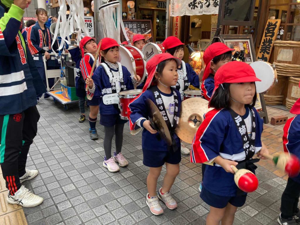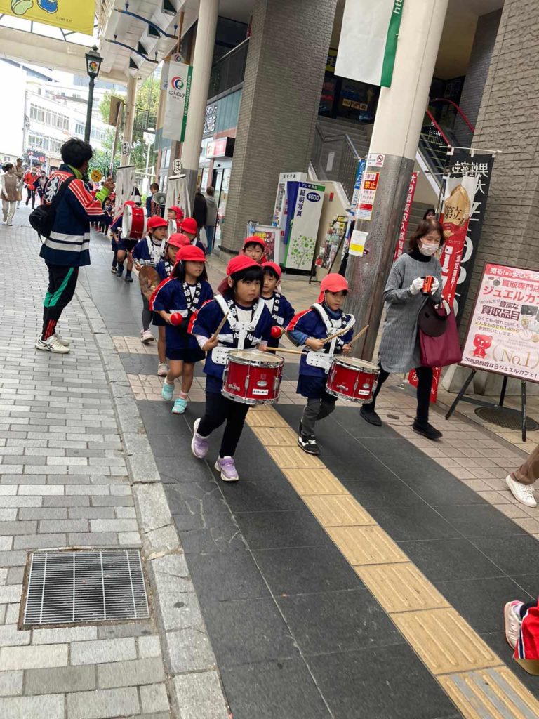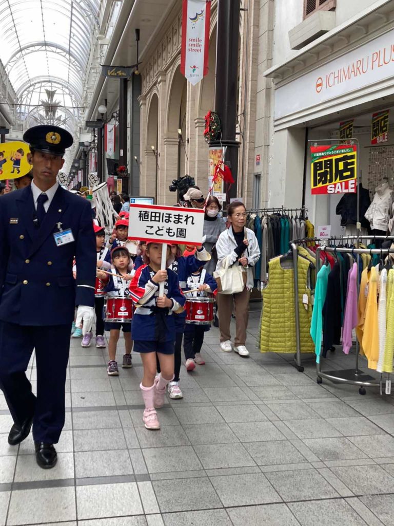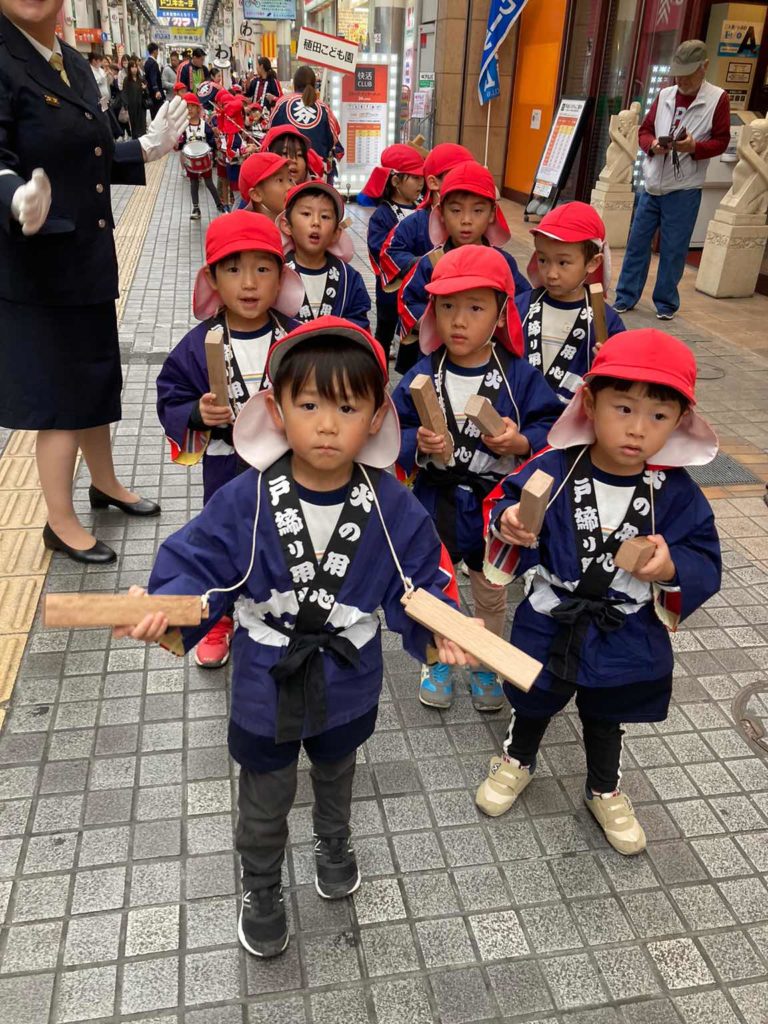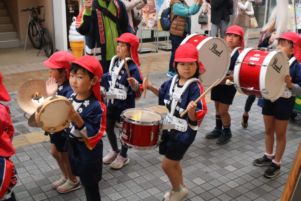 5歳児(にじ組)が鼓笛で“め組のパレード”を演奏し、その後ろから4歳児(つき組)が拍子木を持って「火の用心!マッチ一本 火事の元!!」と呼びかけながら、大分市中央町のアーケード内をパレードしました。