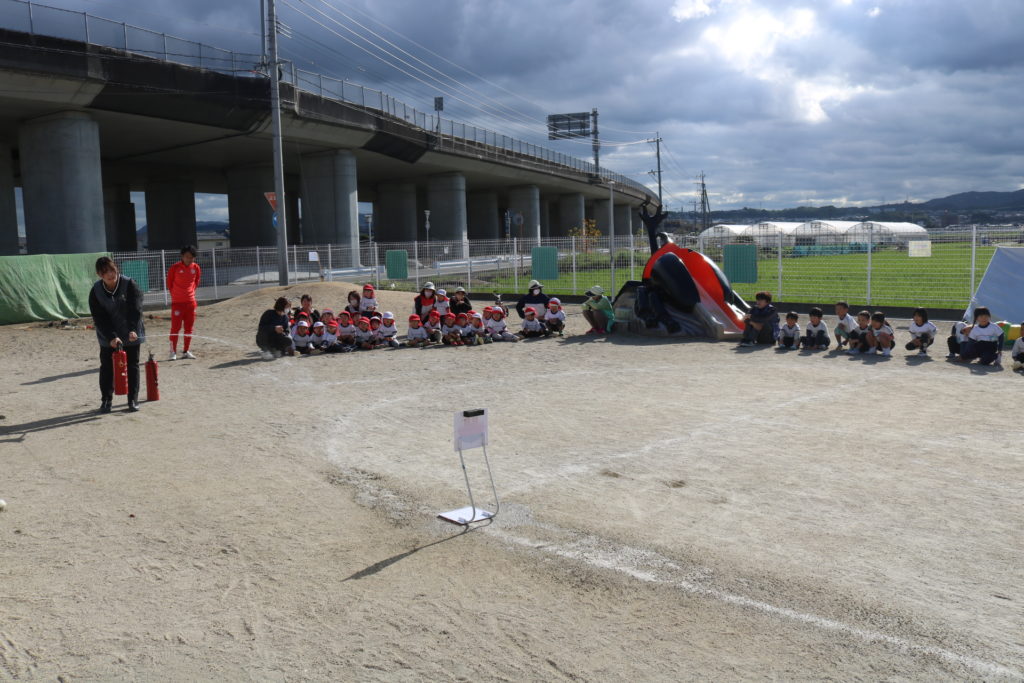 「火事だーー!!」と大きな声で周囲に知らせ、消火していく様子に子どもたちは「がんばれー!」や「おー!」と、手を叩きながら応援してくれました。