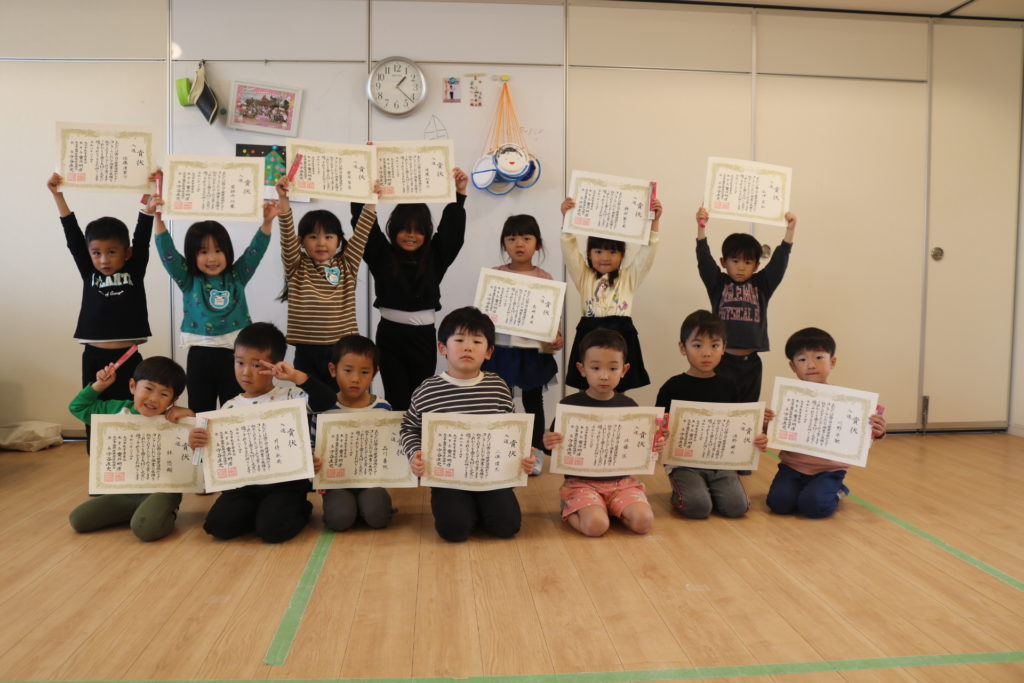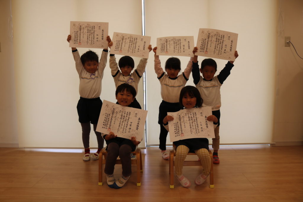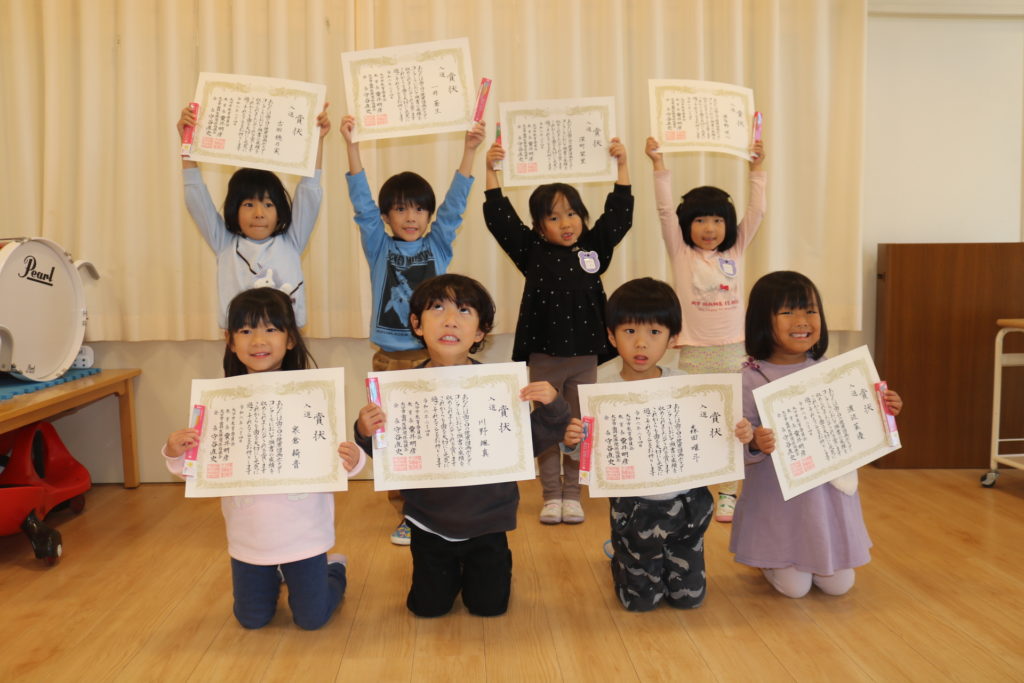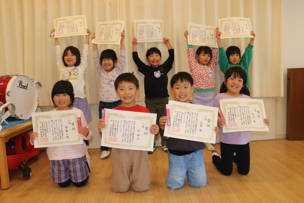 イメージを膨らませ、クレヨンや絵の具を使って細部まで一生懸命描いていた子どもたち。ひとりずつみんなの前に出て、園長先生から賞状や参加賞を受け取り、嬉しそうに笑っていました。