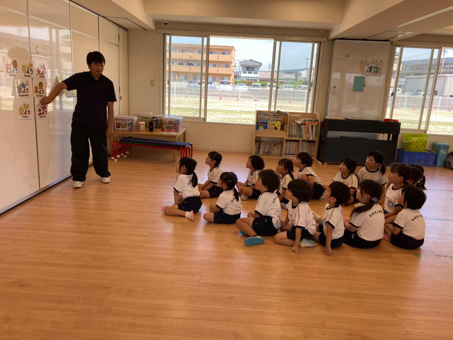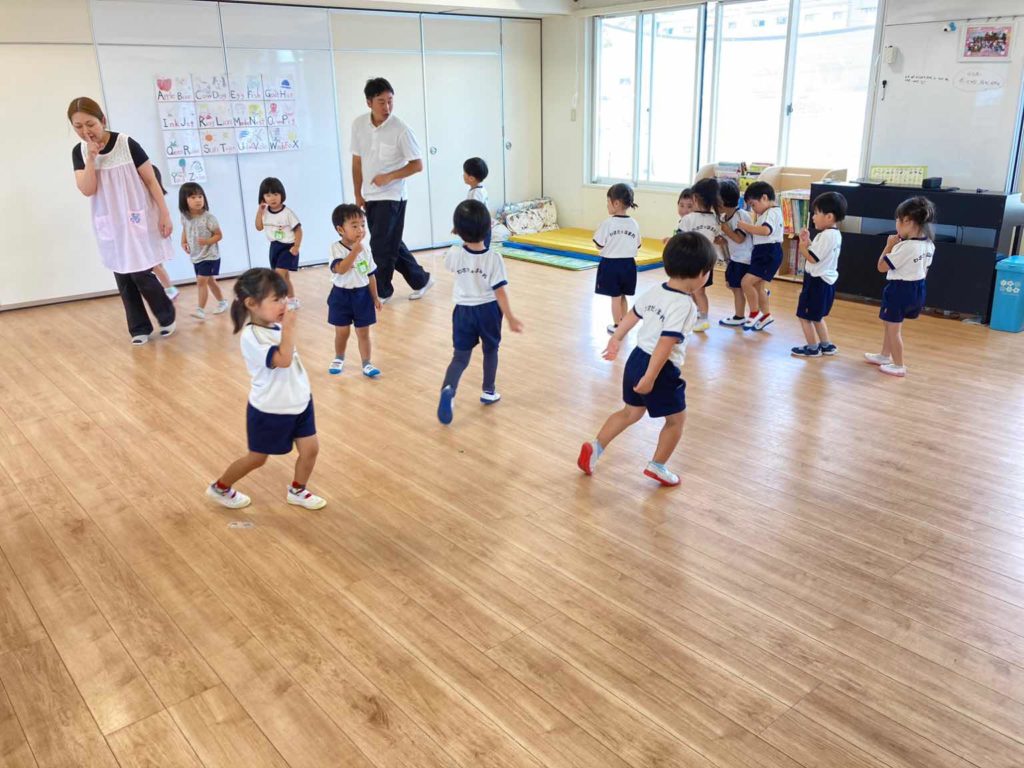 英語教室がない日でも、朝の集まり後、保育者が「今日のお天気は何ですか?」と質問し、子どもたちが「今日のお天気は、晴れです。It's sunny today」と答えるなど、毎日天気のおさらいをしています。