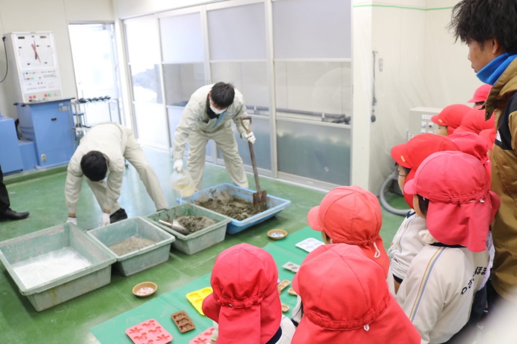 粉からコンクリートの液体になるまでの工程を見せて頂き、食い入るように眺め興味津々な様子の子どもたちでした。