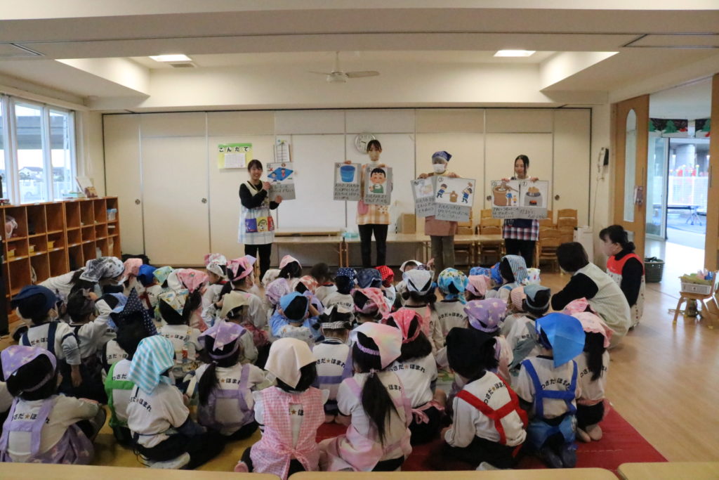エプロン・三角巾・マスクを着用し、いよいよおもちつきが始まると「がんばれ~!」と応援しつつ「やりたい!」とやる気にあふれていました。