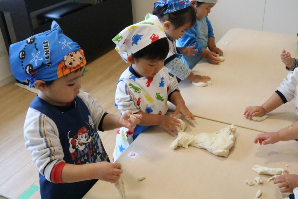 1歳児(はな組)・2歳児(そら組)は、お部屋で小麦粉粘土をして遊びました。おもちに似たもちもちとした感触に虜になっていた子どもたちです。