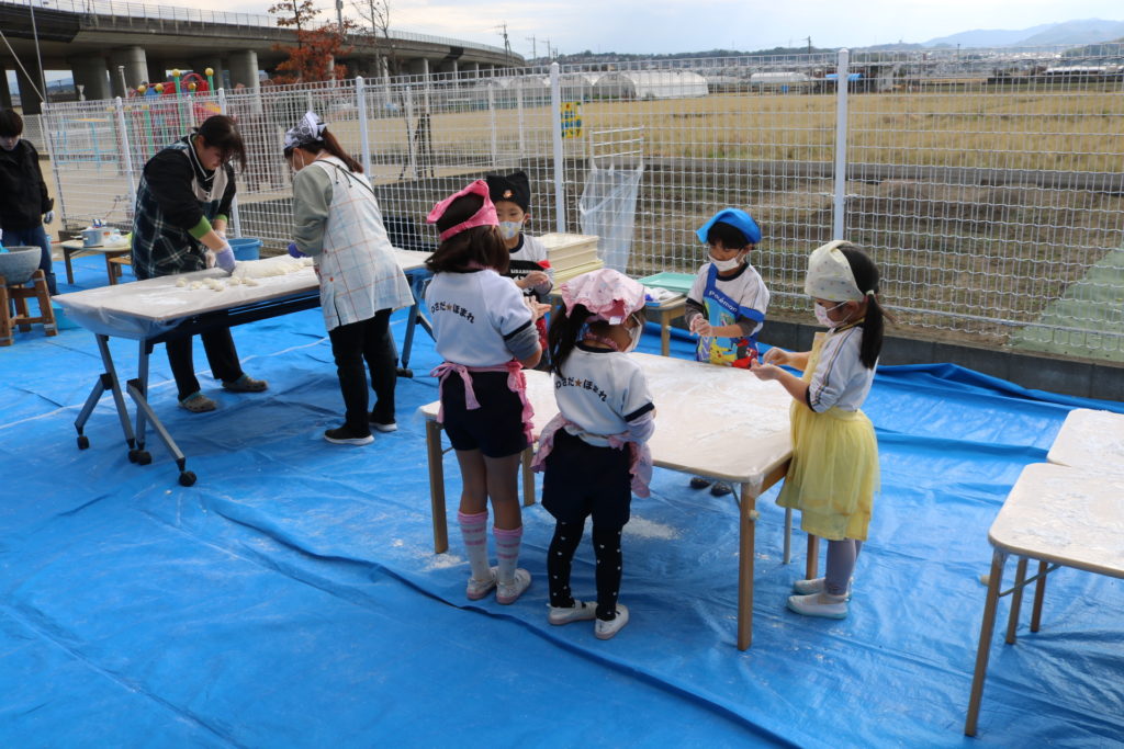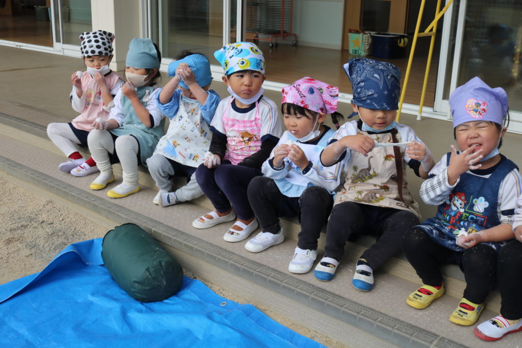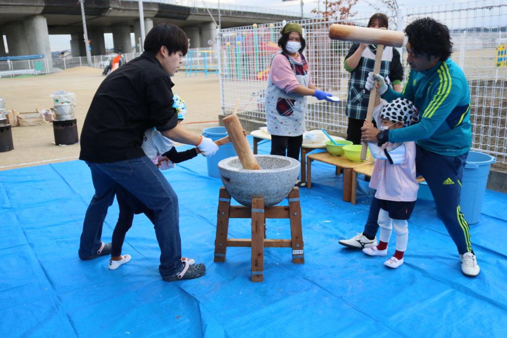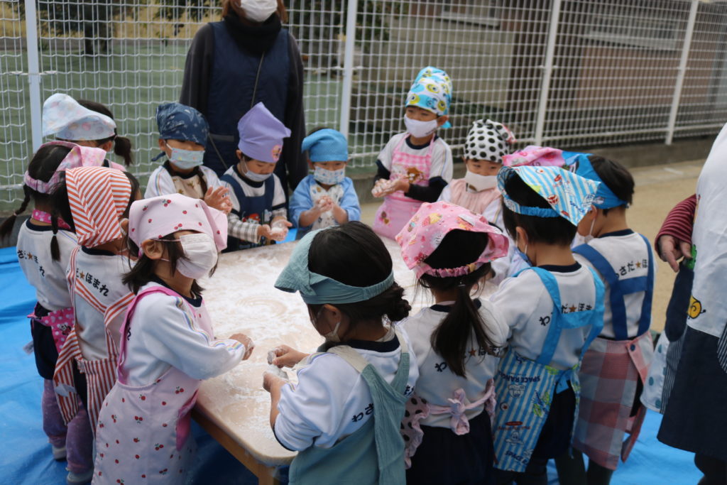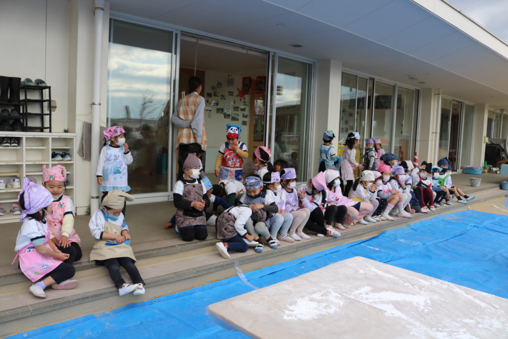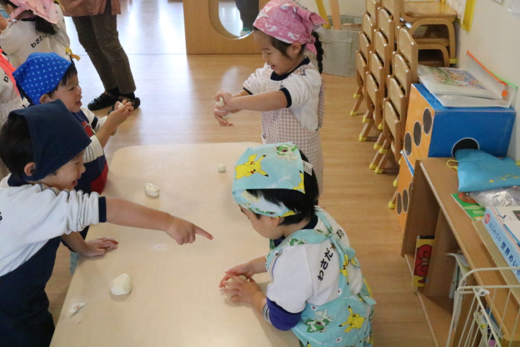 「よいしょー!」の掛け声に合わせながら実際に力強くもちをついたり、丸める際には「もちもちしてる~!」と感触を楽しみながら、きれいに丸の形を作ろうと一生懸命な子どもたちでした。