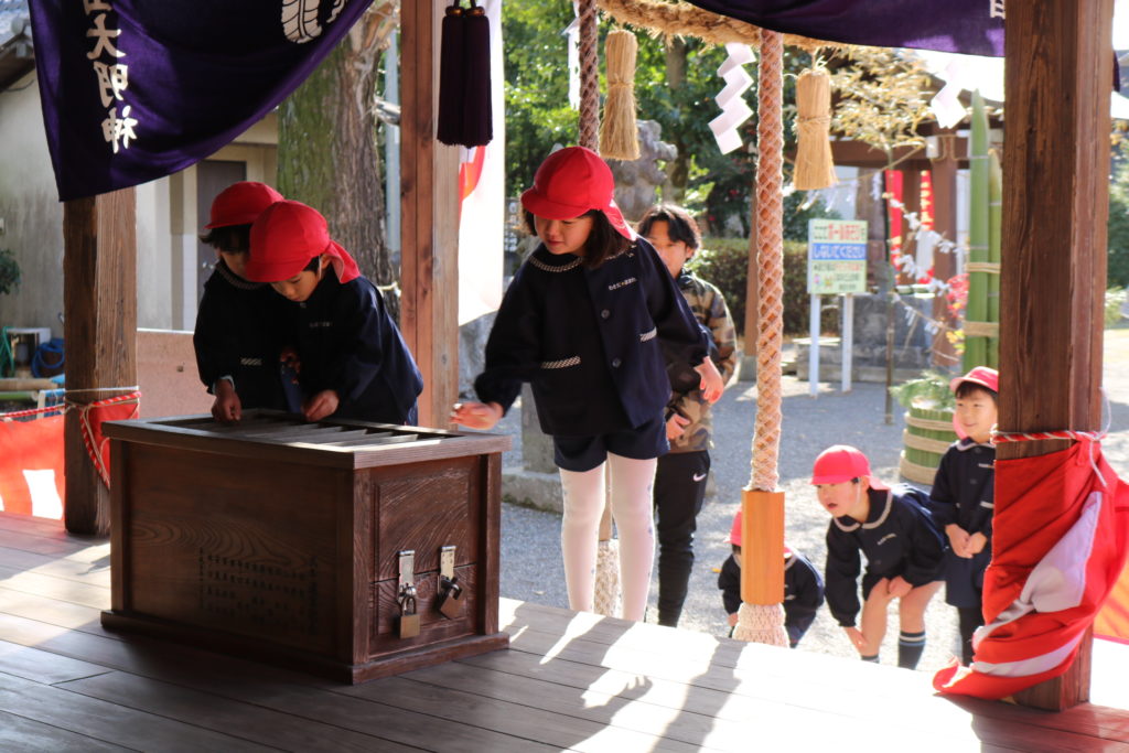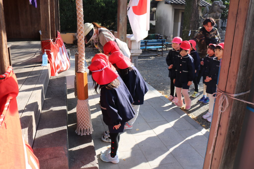 お賽銭を入れ、二礼二拍手一礼の仕方を教わりながら、お願い事をしていた子どもたちです。