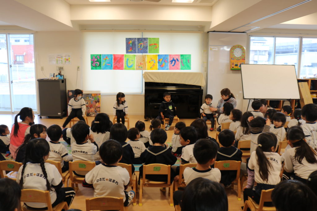 1月は前に出るお友だちがいつもより少なめで、みんなから注目され緊張の面持ちの子どもたちでした。それでもしっかりと自分の名前や好きな物を答えていて感心します。