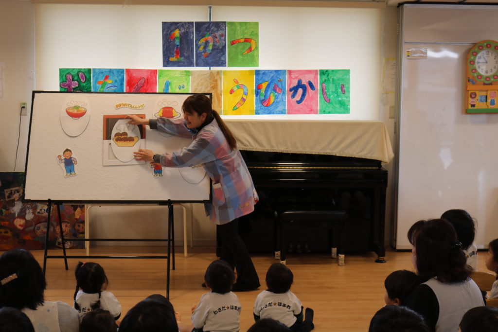 保育者からの出し物は“まほうのでんしレンジ”をパネルシアターでした。家に届いた不思議な電子レンジの話で、お皿を入れてチンするとごちそうができあがる不思議な楽しいお話でした。