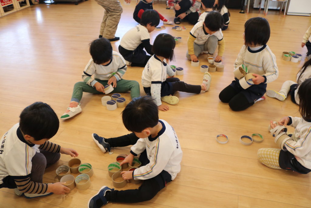 たくさんのテープの芯や、ラップなどの芯を持参して頂いており、それを使って遊びました。