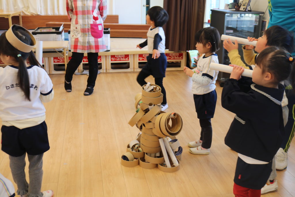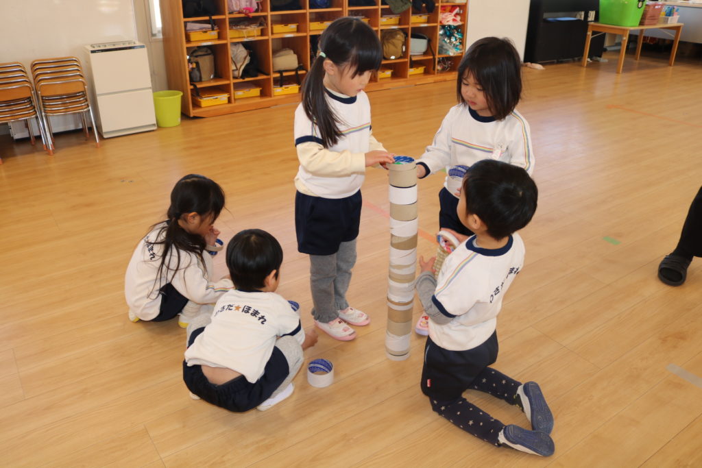 どれくらい高くできるか友だちと協力しながら積み上げたり、丸い芯を使ってどんな形ができるのか話しながら様々な形を表現したりして遊びました。