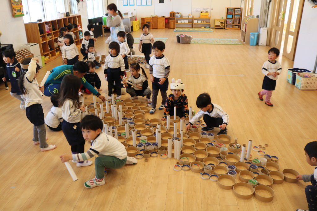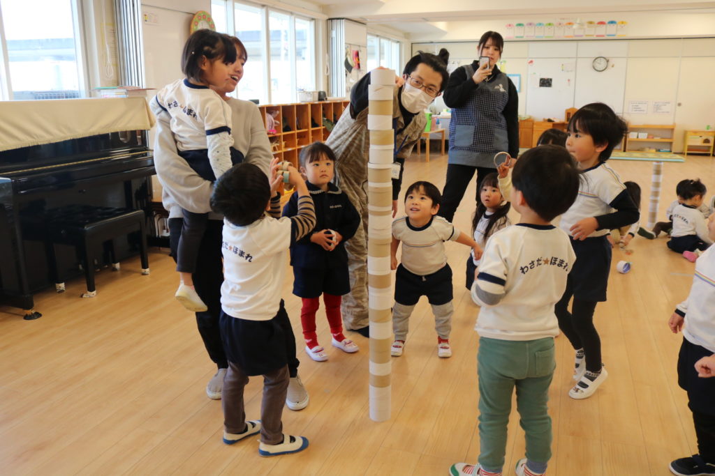 自分の身長よりも高く積み上げ「先生やって~」と大人の力も借りながら、どれだけ高くなるのかワクワクした様子で目を輝かせながら見ていた子どもたちでした。