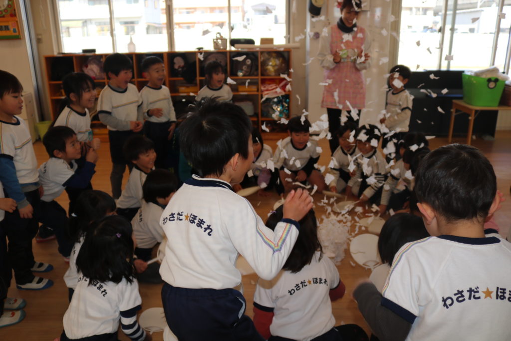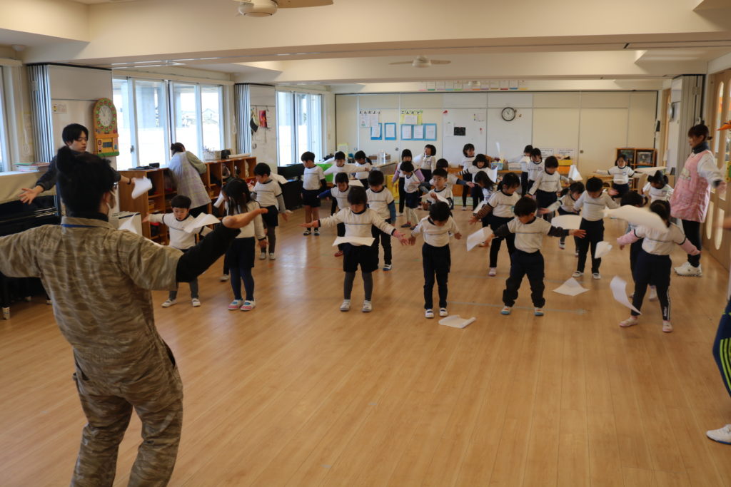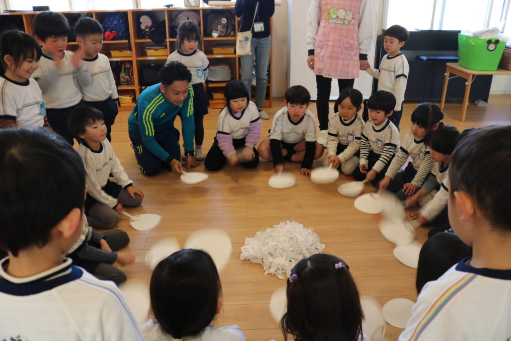 最後には、たくさん遊びこんだ紙を小さく破り、みんなで紙吹雪を飛ばしました。中心に集め、タイミングを合わせて「1.2.1.2!」とあおいでいくと、徐々に舞い上がってきて、きれいに舞い散っていました。