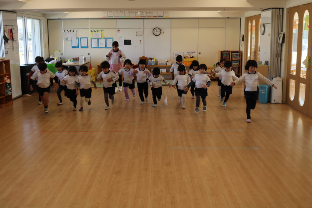 4歳児(つき組)・5歳児(にじ組)は、習字紙を使って、遠心力で紙を落とさない方法を教わり、真剣な顔で挑戦していました。落ちてしまったら「もう一回!」と負けず嫌いを発揮しつつ夢中になって取り組んでいました。