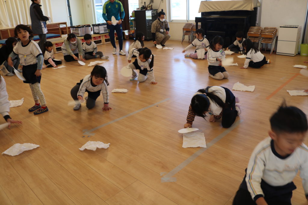 紙を丸めて皺をつけたり、それをまた伸ばしたり、うちわであおぎながら前に進んだり、様々な遊び方を教えていただきました。