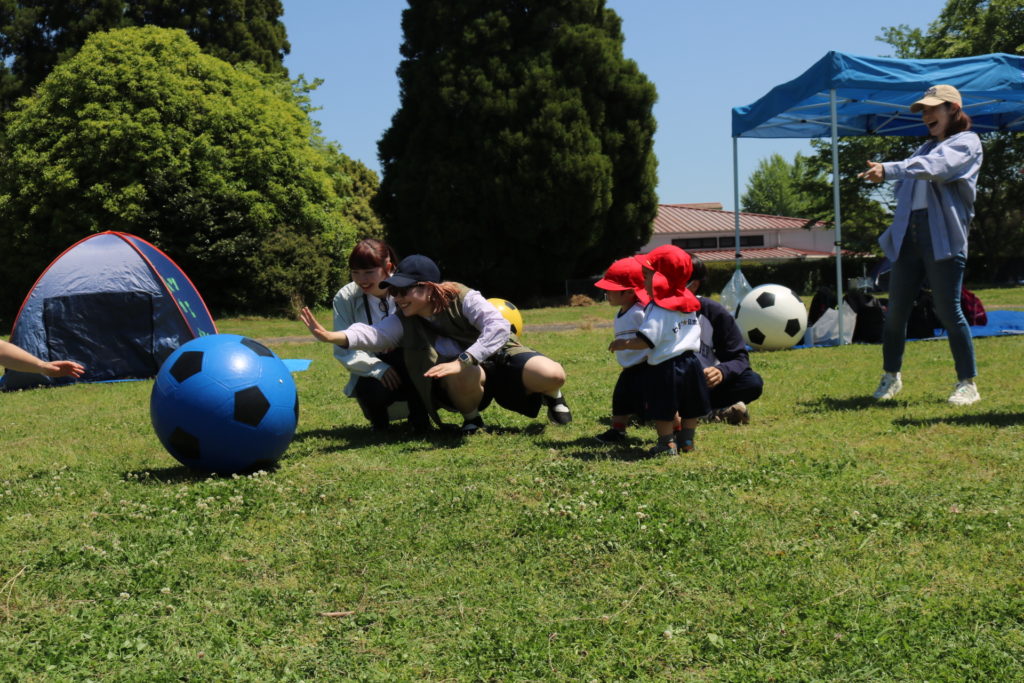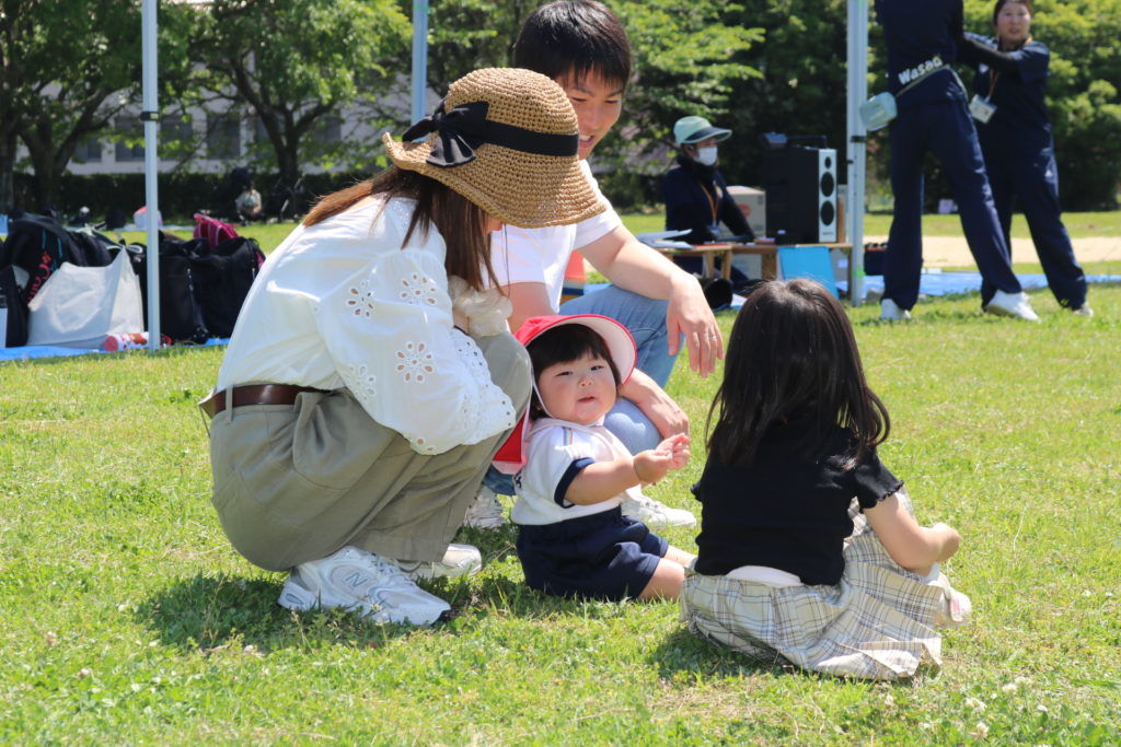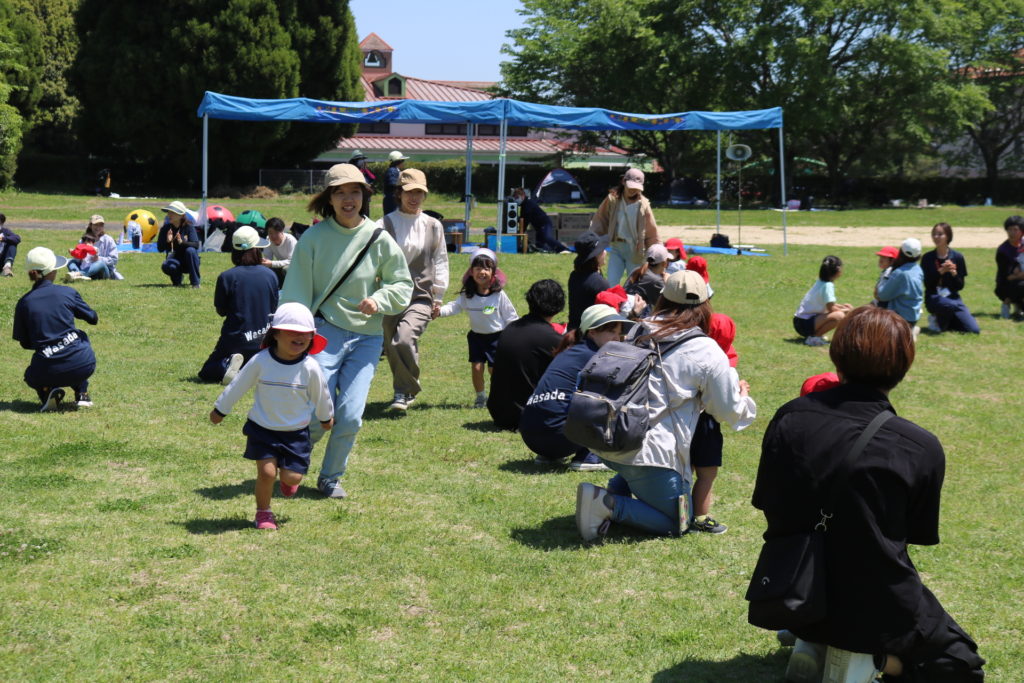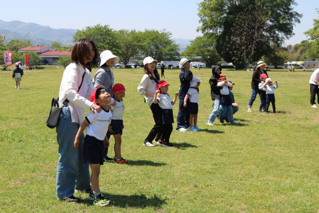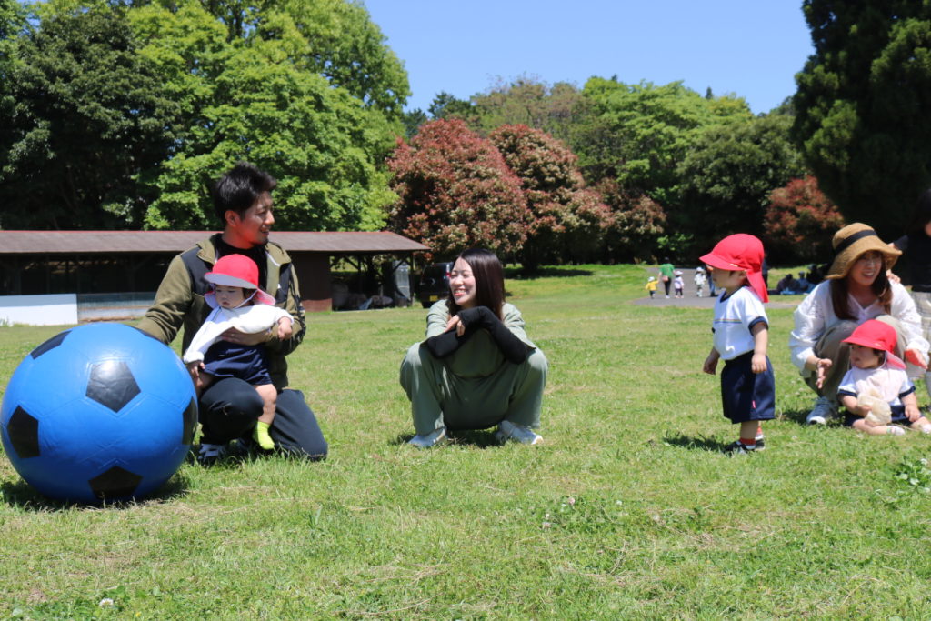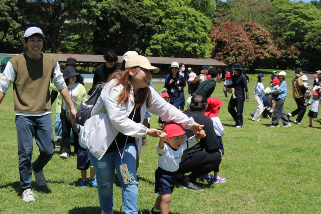 青空が広がり緑が綺麗な中、お見知り親子遠足でみどりマザーランドに行って来ました。まずは、体操で体をほぐして行きました。ジャイアントパパの体操ではジャイアントパパの曲名にちなんで、ジャイアント森永先生が登場してくれ、盛り上げてくれました。体もほぐれてきたら、親子の触れ合い遊びやゲームに移ってきました。親子で触れ合い、楽しむ姿は、とても素敵であり愛の溢れる時間となりました。最後は保護者のみで参加者を募り職員のチームも含め、リレー対決をしました。保護者の方達のチームはとても早く、われわれ職員のチームは最下位で残念ではありましたが、皆で楽しめたので良かったです。とても素敵な遠足になりました。保護者の皆様、ご協力ありがとうございました。
