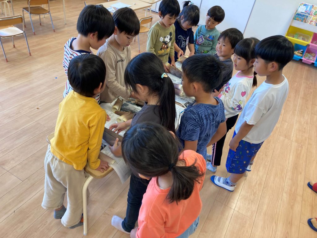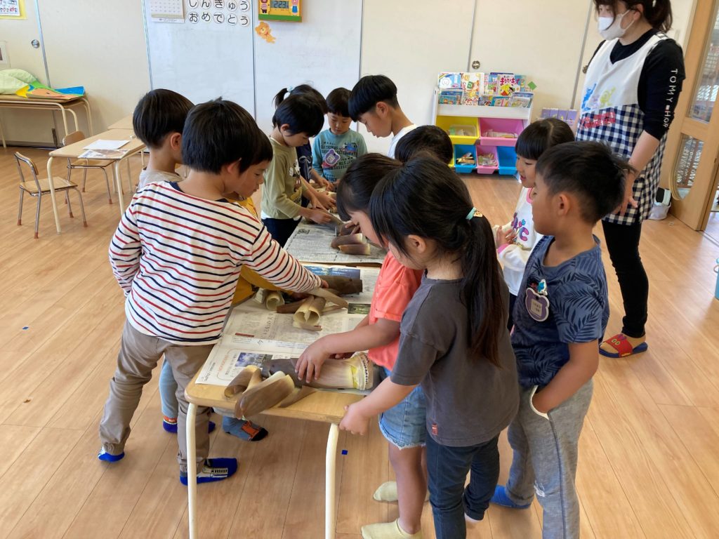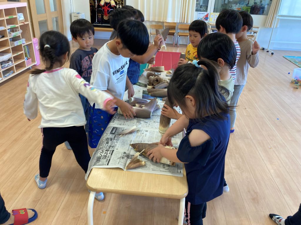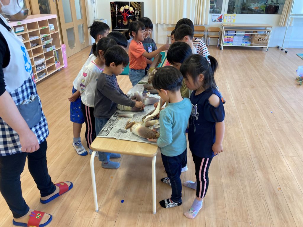 5月の旬の食べ物と言えば!そう!たけのこ!!今日は、この、たけのこの皮むき体験を年長のにじ組さんがしました。たけのこの独特な匂いに「たけのこの匂いだ」「おばあちゃんの家でしたことある」「皮をむいたら中の色が変わって、つるつるや」などなど、楽しそうにむいていました。たけのこだけでは、ありませんが、いろんな物を食べて、たけのこのように、すくすくと成長してほしいですね。
