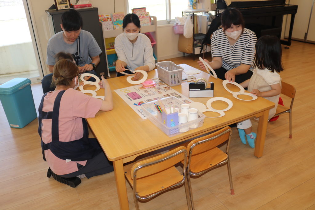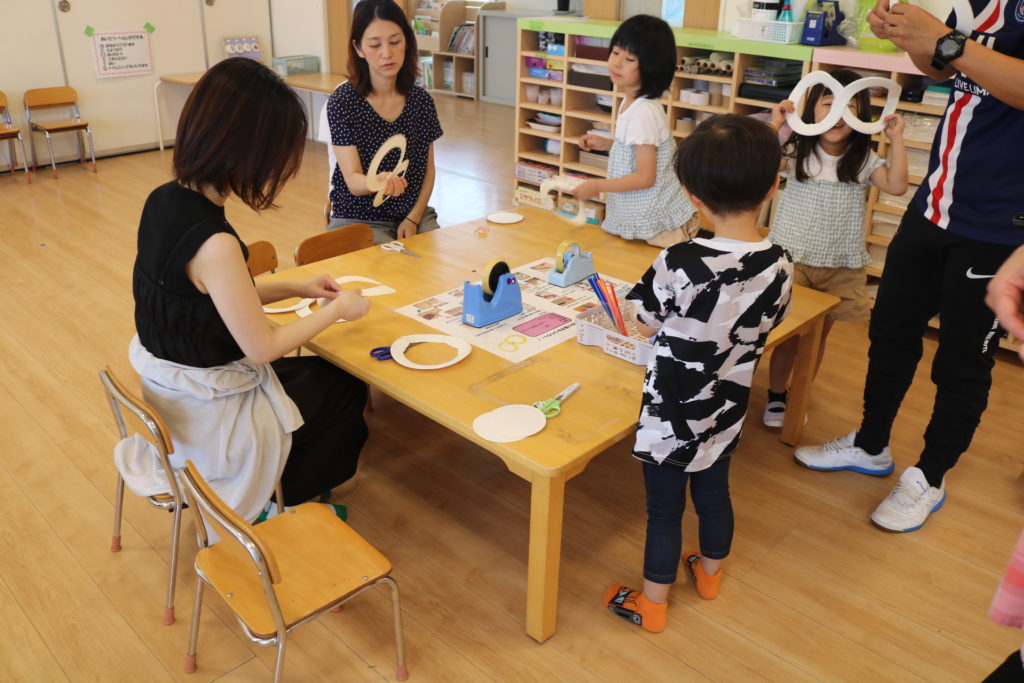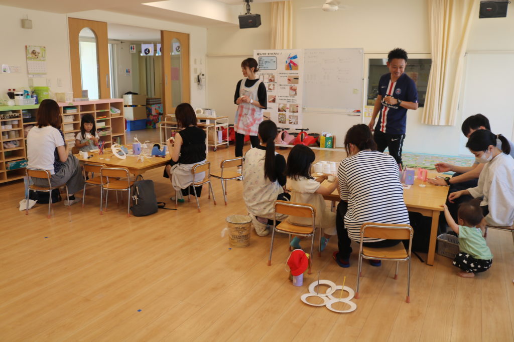 今回の家庭教育学級「ひだまり」は「手作りオモチャを作って遊ぼう」です。紙皿と紙コップ、ストローで2種類の手作りオモチャを作りました。1つめは紙皿とストローを使った、紙皿風車。2つめは紙コップとストローを使った、紙コプター!親子で一緒にお話をしながら楽しく作る姿が見られていました。出来上がったら、作ったオモチャで遊んでみようと、皆で園庭に出て遊びました。走って風を受けるとクルクルと回りだし笑顔いっぱで楽しんでいました。みんな上手に出来ましたね★