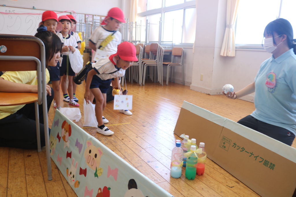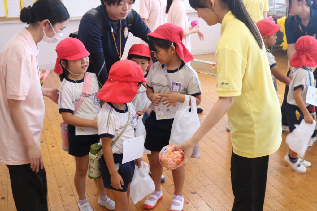 福徳高校のこどもフェスティバルに行ってきました!保育教諭を志す学生さん達が各教室に、こども達の為にお店屋さんや、ボーリング、お魚釣り、ボール送りなどの遊びを沢山準備をしてくれていました。学生さんから笑顔で話しかけられながら、楽しく触れ合い遊ぶことが出来ていましたよ。可愛いお面に素敵なアクセサリーなどもあり、こども達はとても喜んでいました。お土産もいただき、福徳高校の皆さん、ありがとうございました。次回は稙田ほまれこども園に来てぜひ一緒に遊びましょう♥お待ちしてます!