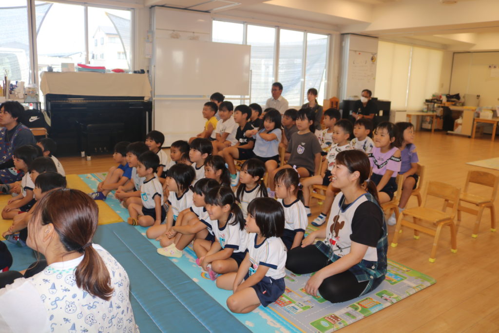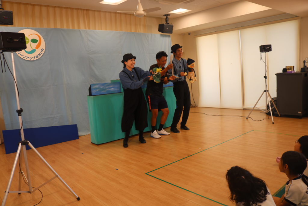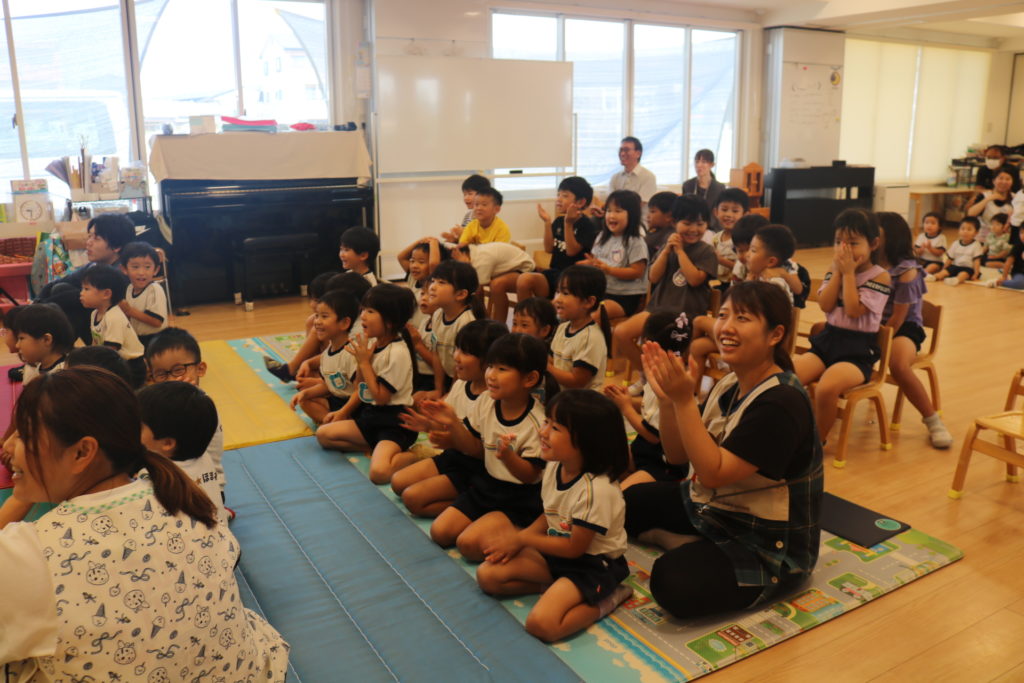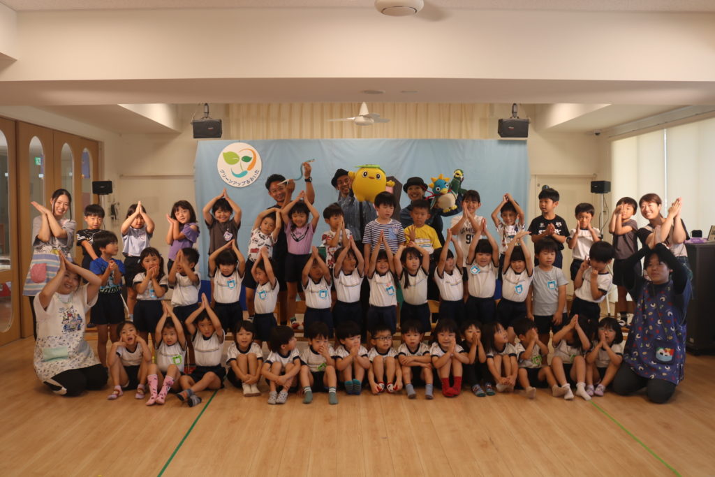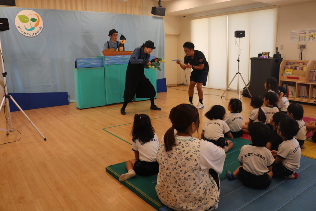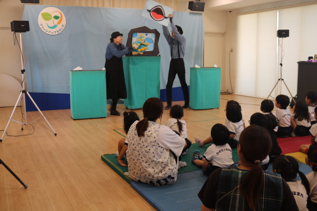 環境劇巡回公演「グリーンアップおおいた~エコシアターあおぞらげきじょう」で大分の自然を守ろう!と言う事で、「すすめ!セツデンロボ」・「ゆかいなウカイ」・「ぺんくんのなんきょくだいぼうけん」の3部作を公演してもらいました!無駄な電気は節電しよう、川にはゴミを捨てないように、綺麗にしましょう。地球温暖化にストップをかけよう!など3つのメッセージが込められている環境劇を楽しく見る事が出来ていました。こども達の未来に向けて大切な資源や自然を守る為にどれも必要な事です。今回だけではなく、日々の保育の中でも、子ども達に環境について資源について、知らせて行きたいと思います。