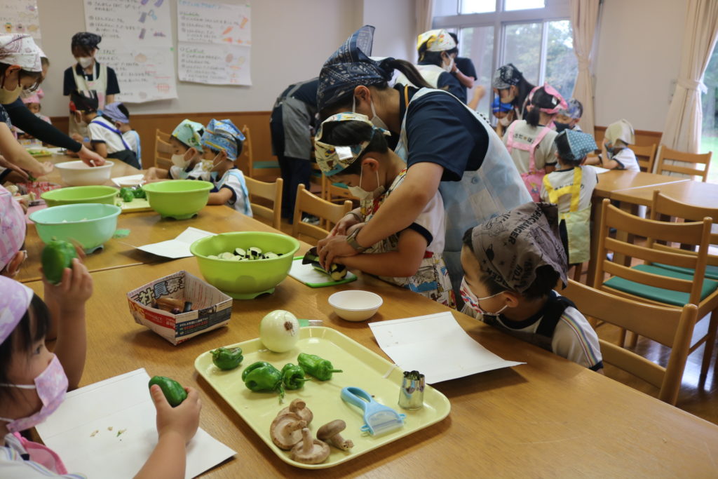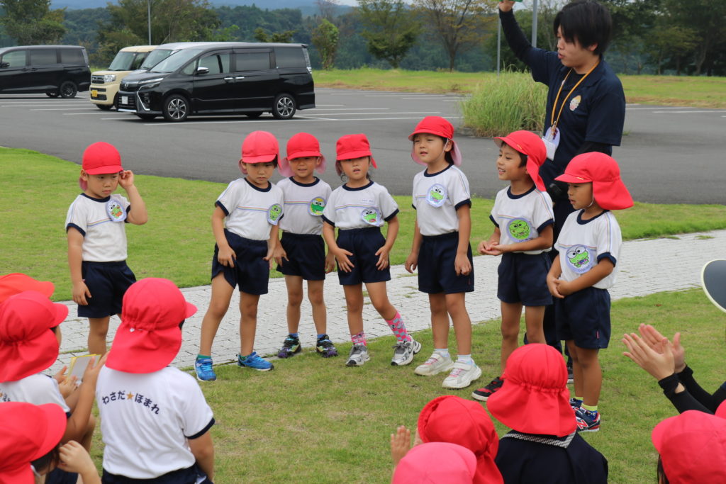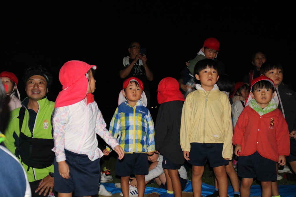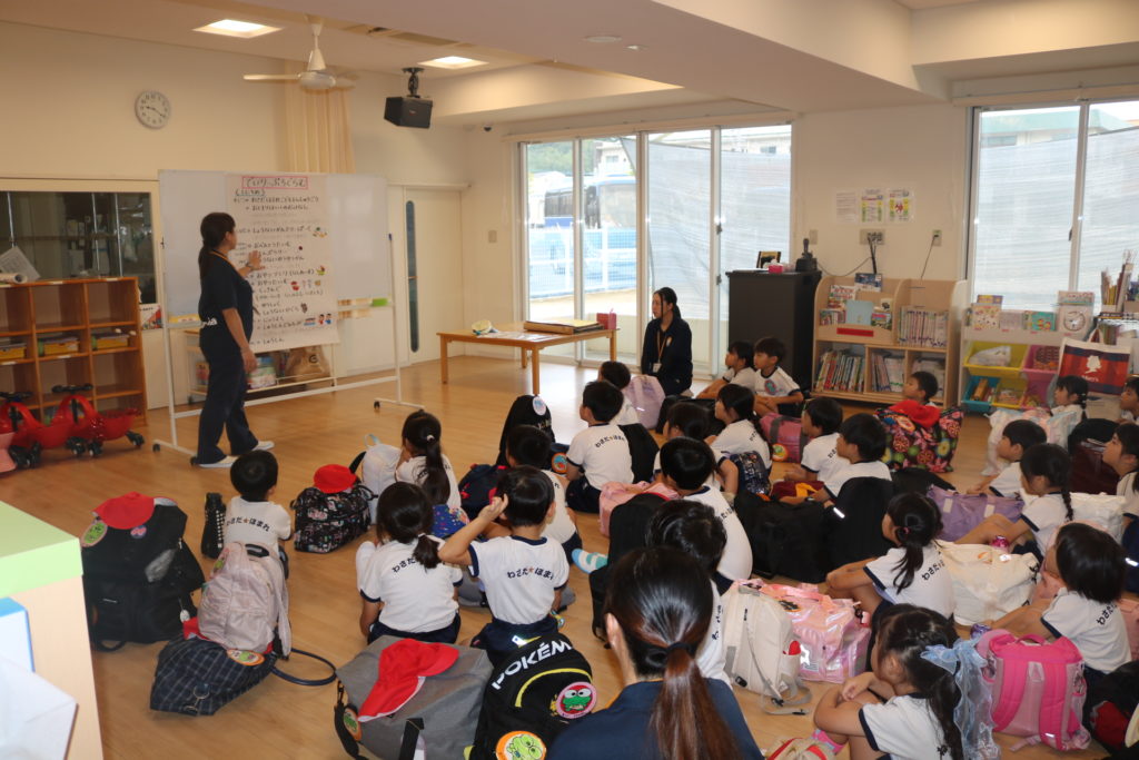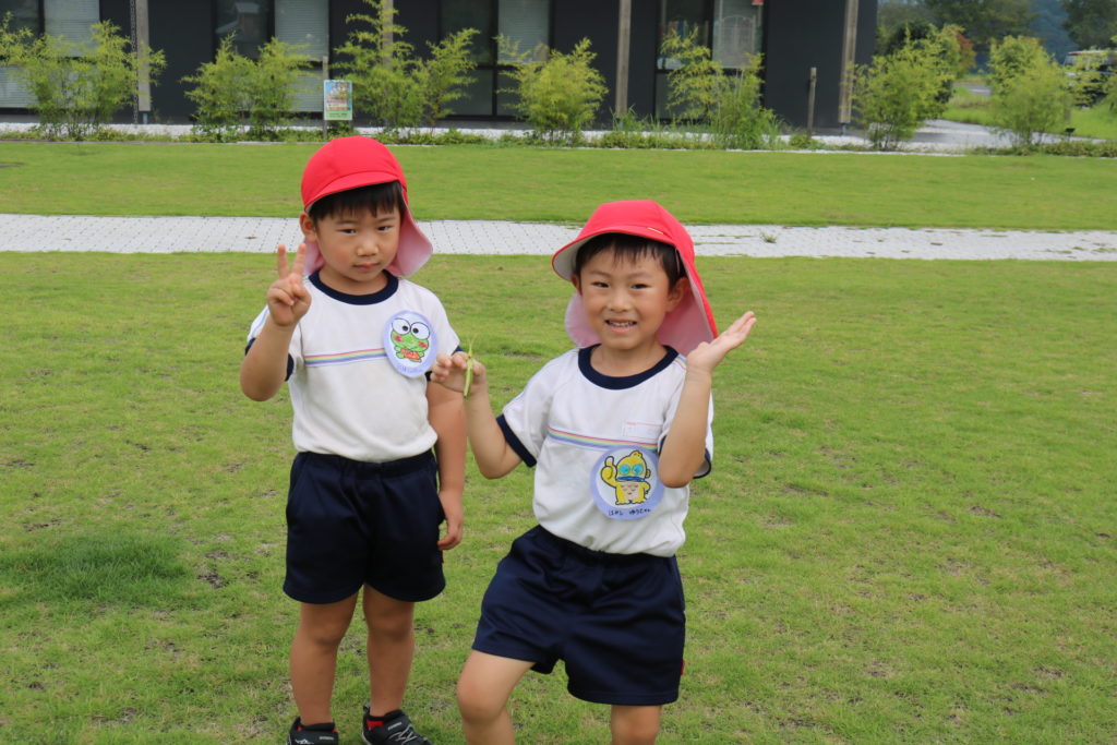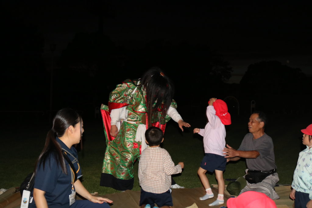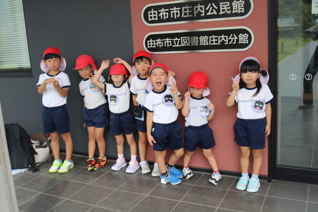 4、5歳児で庄内ゆうゆう館に、お泊まり保育に行って来ました。庄内カントリーパーク(庄内公民館)では遊具で遊び、大きなバッタやカマキリを捕まえたり、スタンプラリーをしたりと日頃とは違う環境の中で遊ぶ事が出来て、とても楽しんでいました。昼食もお母さん、お父さんの手作り弁当で笑顔で美味しくいただきました。この時期の庄内と言えば、旬の梨です。庄内の梨を使って午後のおやつ作りと、夕食のデザート(フルーツポンチ)作りをしました。おやつはアイスクリームに梨のジュレとお菓子をトッピングして食べ、夕食のデザート作りでは梨の型抜きをし、ミカンや桃などの果物を自分でつぎフルーツポンチを作って行きました。後は夕食のカレーにのせるトッピングのキノコや野菜を切っていきました。自分達で作った、おやつ、夕食、デザートは特別美味しく!皆でいただきました。夕食後は庄内のお神楽を見に行き、子ども達は鬼が出てくると泣いて先生達の後ろに隠れたりしながらもよく見ていましたよ。4歳児の女の子が鬼と一緒にステージ上がったのですが泣く事もなく、鬼と演技をしたことに驚きを隠せずに感心をし、とても度胸と勇気がある姿をみせてくれました!あっという間のお泊まりでしたが、この経験がまた成長に繋がってくれる事と思います。楽しい思い出が出来ました♥
