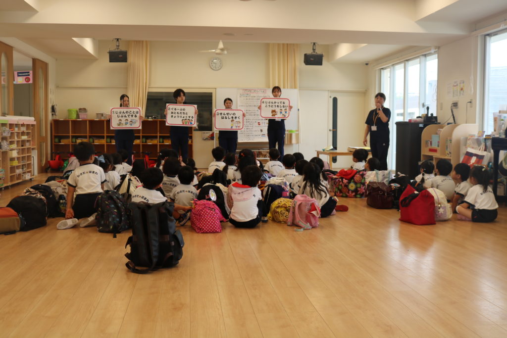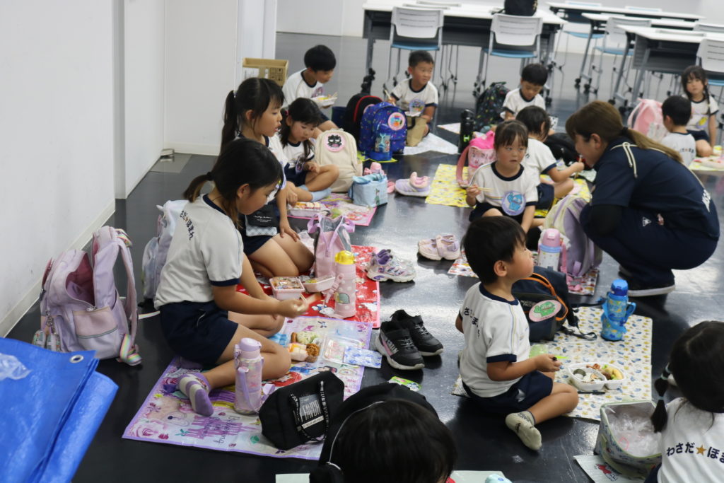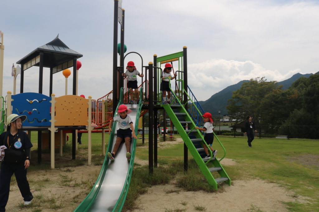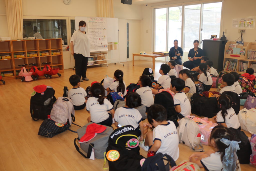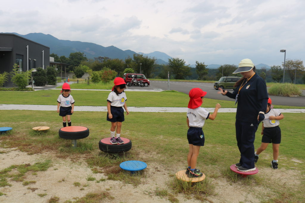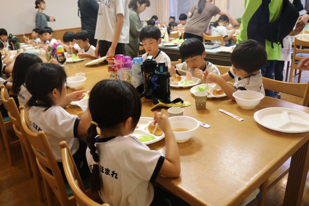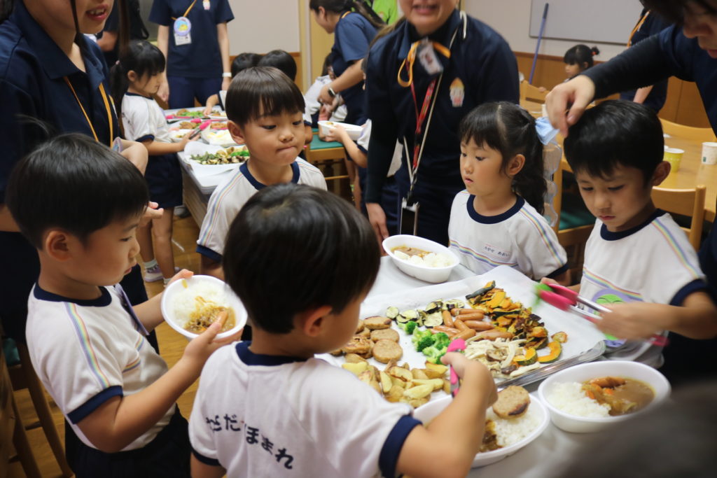 4、5歳児で庄内ゆうゆう館に、お泊まり保育に行って来ました。庄内カントリーパーク(庄内公民館)では遊具で遊び、大きなバッタやカマキリを捕まえたり、スタンプラリーをしたりと日頃とは違う環境の中で遊ぶ事が出来て、とても楽しんでいました。昼食もお母さん、お父さんの手作り弁当で笑顔で美味しくいただきました。この時期の庄内と言えば、旬の梨です。庄内の梨を使って午後のおやつ作りと、夕食のデザート(フルーツポンチ)作りをしました。おやつはアイスクリームに梨のジュレとお菓子をトッピングして食べ、夕食のデザート作りでは梨の型抜きをし、ミカンや桃などの果物を自分でつぎフルーツポンチを作って行きました。後は夕食のカレーにのせるトッピングのキノコや野菜を切っていきました。自分達で作った、おやつ、夕食、デザートは特別美味しく!皆でいただきました。夕食後は庄内のお神楽を見に行き、子ども達は鬼が出てくると泣いて先生達の後ろに隠れたりしながらもよく見ていましたよ。4歳児の女の子が鬼と一緒にステージ上がったのですが泣く事もなく、鬼と演技をしたことに驚きを隠せずに感心をし、とても度胸と勇気がある姿をみせてくれました!あっという間のお泊まりでしたが、この経験がまた成長に繋がってくれる事と思います。楽しい思い出が出来ました♥