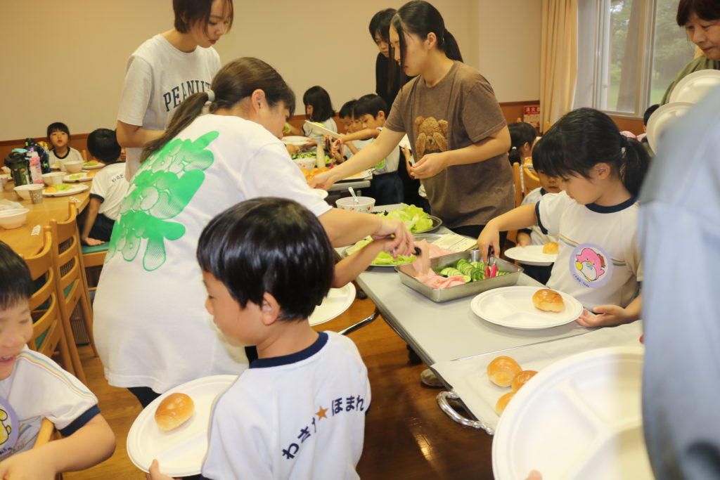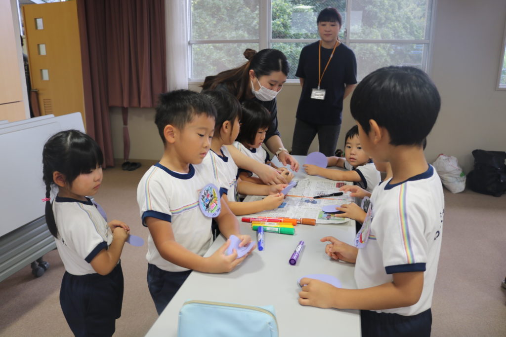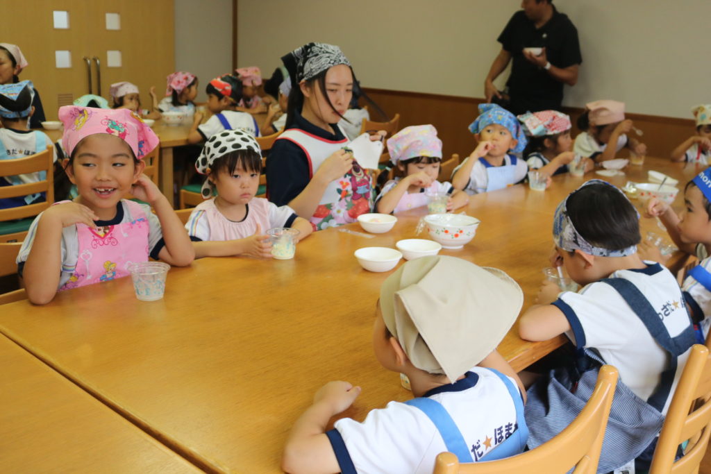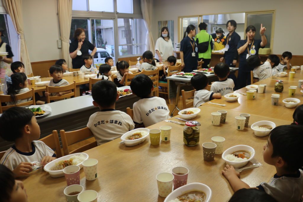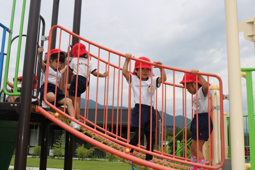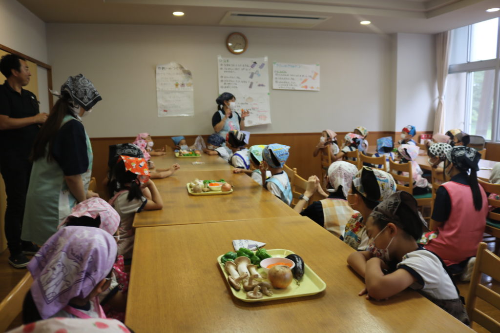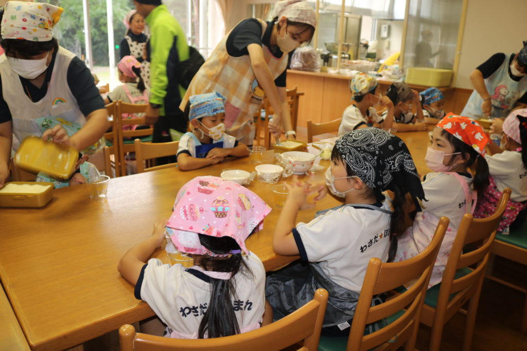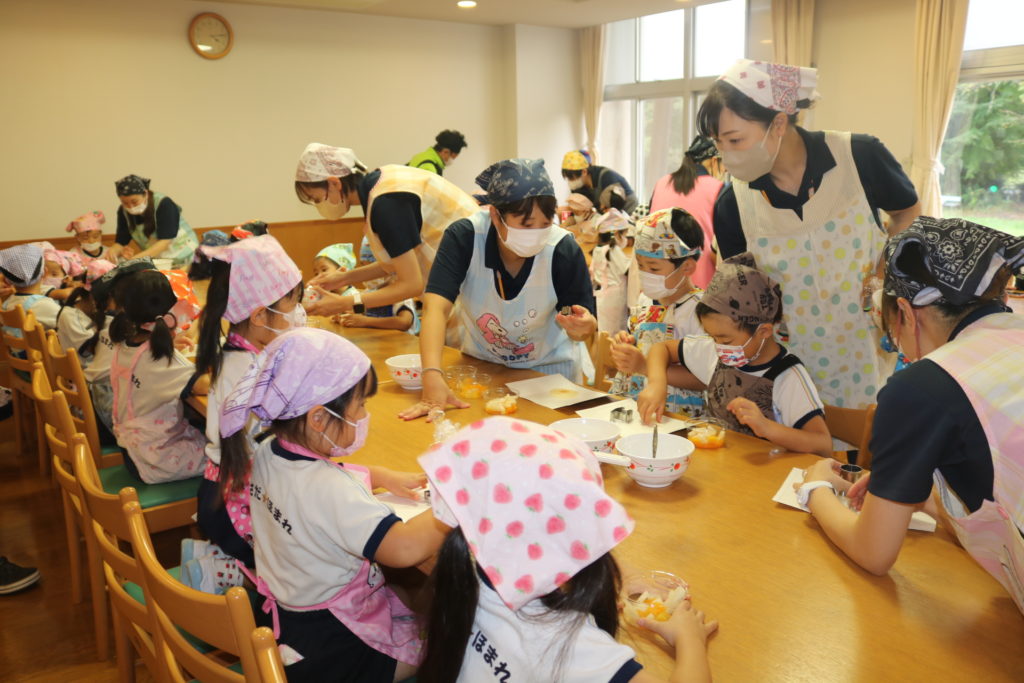 4、5歳児で庄内ゆうゆう館に、お泊まり保育に行って来ました。庄内カントリーパーク(庄内公民館)では遊具で遊び、大きなバッタやカマキリを捕まえたり、スタンプラリーをしたりと日頃とは違う環境の中で遊ぶ事が出来て、とても楽しんでいました。昼食もお母さん、お父さんの手作り弁当で笑顔で美味しくいただきました。この時期の庄内と言えば、旬の梨です。庄内の梨を使って午後のおやつ作りと、夕食のデザート(フルーツポンチ)作りをしました。おやつはアイスクリームに梨のジュレとお菓子をトッピングして食べ、夕食のデザート作りでは梨の型抜きをし、ミカンや桃などの果物を自分でつぎフルーツポンチを作って行きました。後は夕食のカレーにのせるトッピングのキノコや野菜を切っていきました。自分達で作った、おやつ、夕食、デザートは特別美味しく!皆でいただきました。夕食後は庄内のお神楽を見に行き、子ども達は鬼が出てくると泣いて先生達の後ろに隠れたりしながらもよく見ていましたよ。4歳児の女の子が鬼と一緒にステージ上がったのですが泣く事もなく、鬼と演技をしたことに驚きを隠せずに感心をし、とても度胸と勇気がある姿をみせてくれました!あっという間のお泊まりでしたが、この経験がまた成長に繋がってくれる事と思います。楽しい思い出が出来ました♥