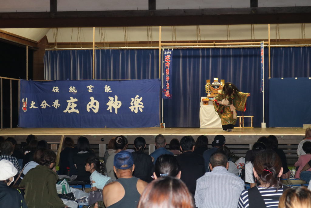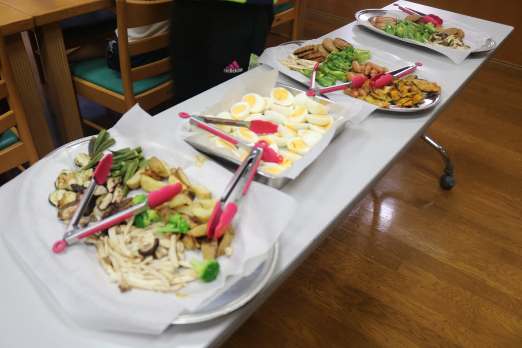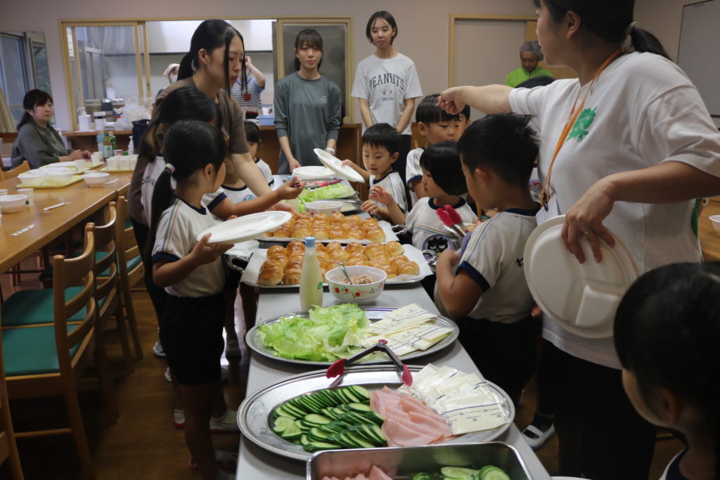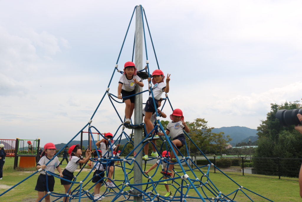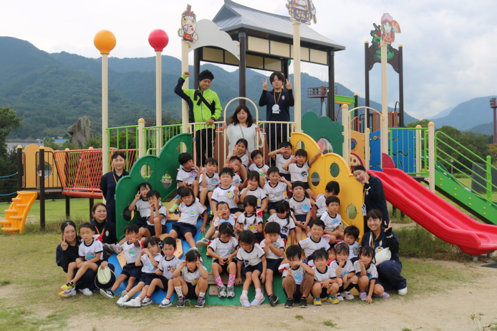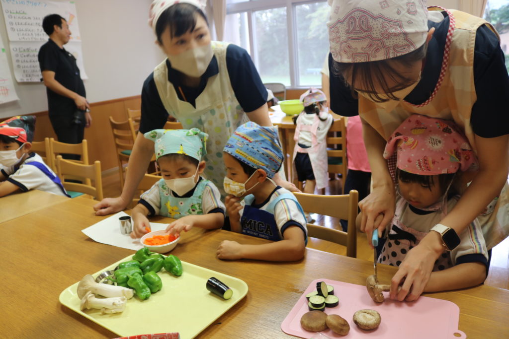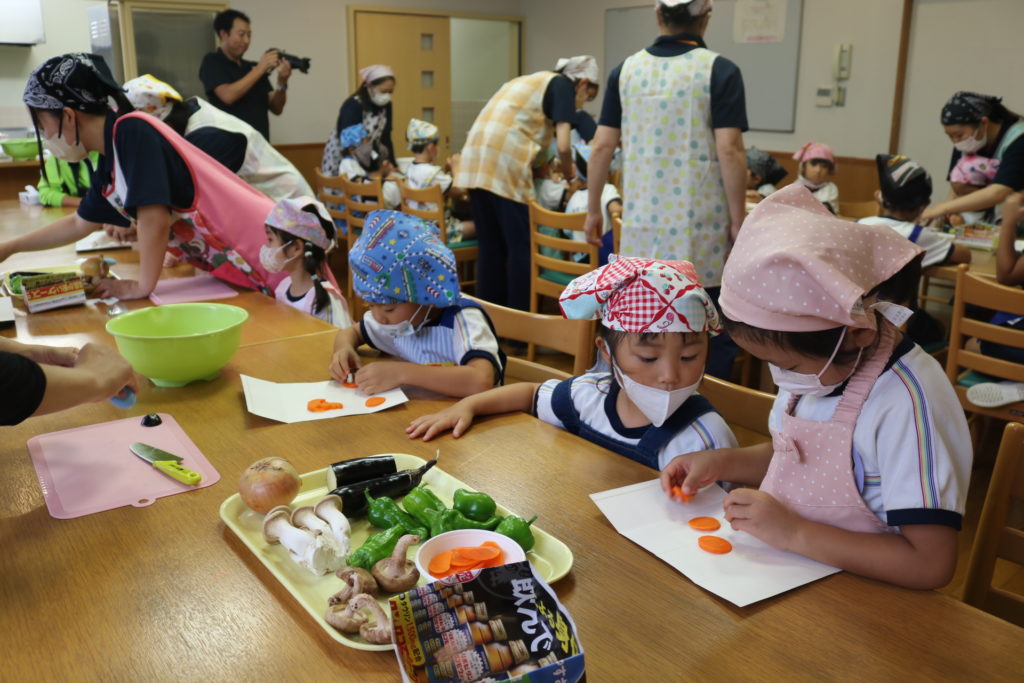 4、5歳児で庄内ゆうゆう館に、お泊まり保育に行って来ました。庄内カントリーパーク(庄内公民館)では遊具で遊び、大きなバッタやカマキリを捕まえたり、スタンプラリーをしたりと日頃とは違う環境の中で遊ぶ事が出来て、とても楽しんでいました。昼食もお母さん、お父さんの手作り弁当で笑顔で美味しくいただきました。この時期の庄内と言えば、旬の梨です。庄内の梨を使って午後のおやつ作りと、夕食のデザート(フルーツポンチ)作りをしました。おやつはアイスクリームに梨のジュレとお菓子をトッピングして食べ、夕食のデザート作りでは梨の型抜きをし、ミカンや桃などの果物を自分でつぎフルーツポンチを作って行きました。後は夕食のカレーにのせるトッピングのキノコや野菜を切っていきました。自分達で作った、おやつ、夕食、デザートは特別美味しく!皆でいただきました。夕食後は庄内のお神楽を見に行き、子ども達は鬼が出てくると泣いて先生達の後ろに隠れたりしながらもよく見ていましたよ。4歳児の女の子が鬼と一緒にステージ上がったのですが泣く事もなく、鬼と演技をしたことに驚きを隠せずに感心をし、とても度胸と勇気がある姿をみせてくれました!あっという間のお泊まりでしたが、この経験がまた成長に繋がってくれる事と思います。楽しい思い出が出来ました♥