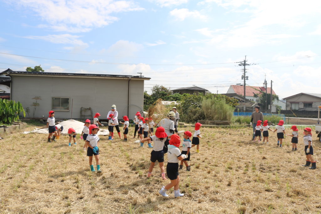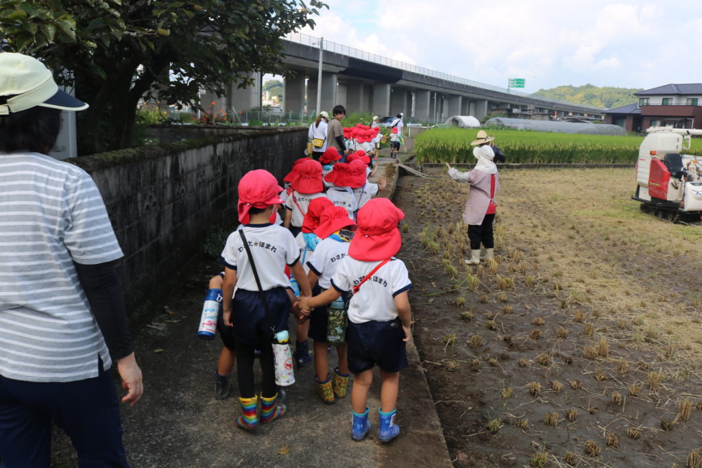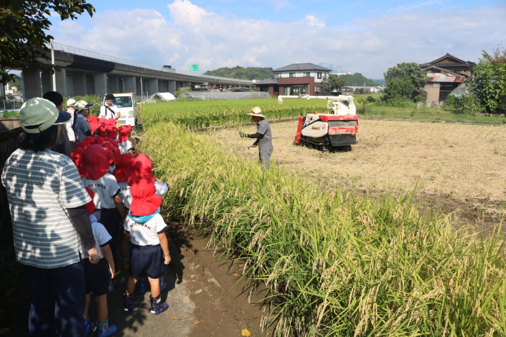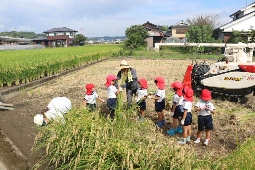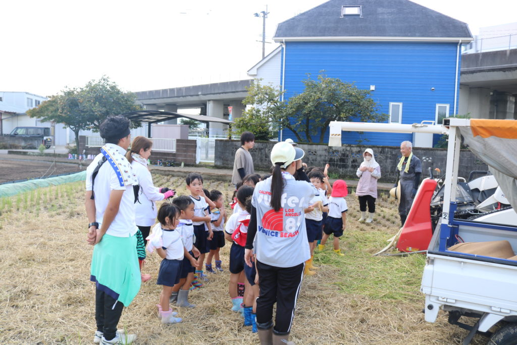 秋晴れの中、年中さんと年長さんで稲刈りに行って来ました。道中は気持ち良く歩き、周りの田んぼの稲が大きく育っているのを見ながら、子ども達も自分達が植えた稲は大きくなっているかなっと思いながら歩き目的地の田んぼに到着しました。皆が植えた稲の名前は「夏ほのか」です。これは暑さにつよく綺麗で美味しいお米です。現地に着くと早速、農家の方から稲刈りについての注意事項(お約束)を聞き、年中、年長に分れて稲刈りをしていきました。先生と一緒にカマを持って順番に稲を刈っていき、年長さんは一度、先生と一緒に刈った後は一人での稲刈りに挑戦してみました。すると、のみこみが早く手つきもよく上手に刈る事が出来ていました!楽しんで刈る姿もありましたが、その反面、子ども達なりに大変さを感じていたようです。稲刈り体験は食育の一環でもあり、また毎日美味しいご飯が食べられるのはこういった農家の方達がいるからこそであり、改めて感謝の気持ちを感じた瞬間でした。だからこそ、感謝の気持ちをこめて「いただきます」「ごちそうさま」の言葉が大切になってきますね!稲刈りの後は、田んぼの中で遊びました!カエルを追いかけ、カマキリやコオロギを捕まえて遊んだり、ワラで遊んだりと自然の中でのびのびと遊ぶ事も出来ました。コンバインに刈った稲を通し茎と穂にわけ、お米が出てくる所も見た子ども達です。とても良い経験になりました!