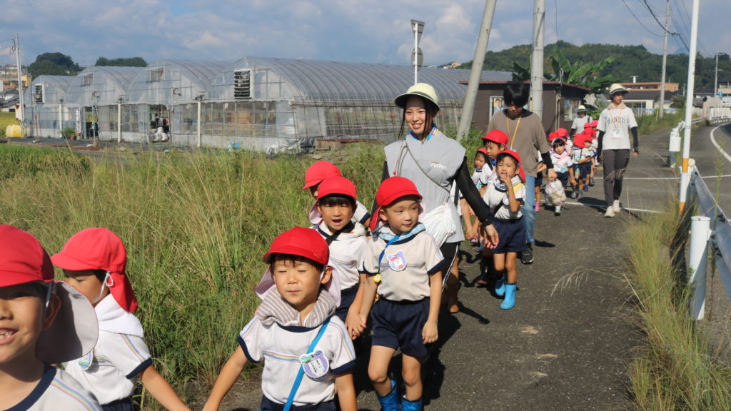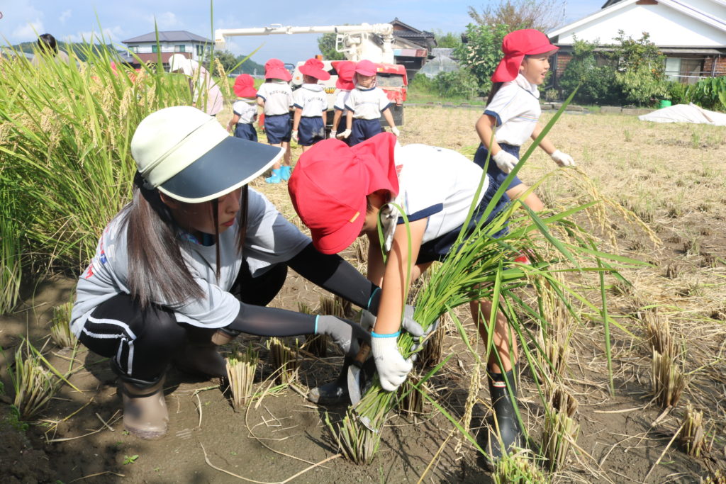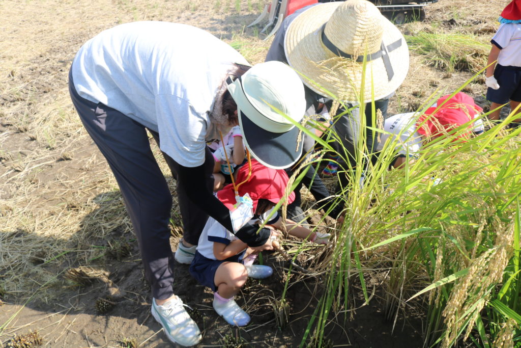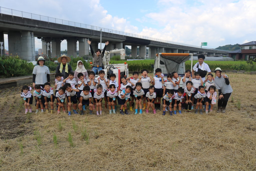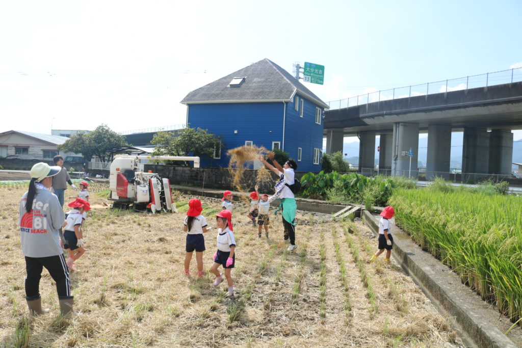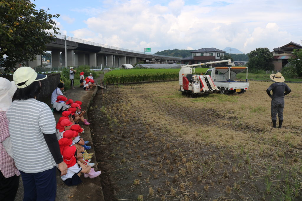 秋晴れの中、年中さんと年長さんで稲刈りに行って来ました。道中は気持ち良く歩き、周りの田んぼの稲が大きく育っているのを見ながら、子ども達も自分達が植えた稲は大きくなっているかなっと思いながら歩き目的地の田んぼに到着しました。皆が植えた稲の名前は「夏ほのか」です。これは暑さにつよく綺麗で美味しいお米です。現地に着くと早速、農家の方から稲刈りについての注意事項(お約束)を聞き、年中、年長に分れて稲刈りをしていきました。先生と一緒にカマを持って順番に稲を刈っていき、年長さんは一度、先生と一緒に刈った後は一人での稲刈りに挑戦してみました。すると、のみこみが早く手つきもよく上手に刈る事が出来ていました!楽しんで刈る姿もありましたが、その反面、子ども達なりに大変さを感じていたようです。稲刈り体験は食育の一環でもあり、また毎日美味しいご飯が食べられるのはこういった農家の方達がいるからこそであり、改めて感謝の気持ちを感じた瞬間でした。だからこそ、感謝の気持ちをこめて「いただきます」「ごちそうさま」の言葉が大切になってきますね!稲刈りの後は、田んぼの中で遊びました!カエルを追いかけ、カマキリやコオロギを捕まえて遊んだり、ワラで遊んだりと自然の中でのびのびと遊ぶ事も出来ました。コンバインに刈った稲を通し茎と穂にわけ、お米が出てくる所も見た子ども達です。とても良い経験になりました!