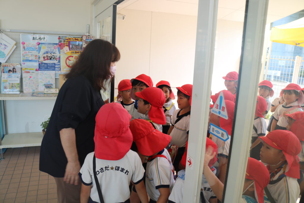 交通安全!車に気を付けて、しっかりと手を上げて渡りましょう!