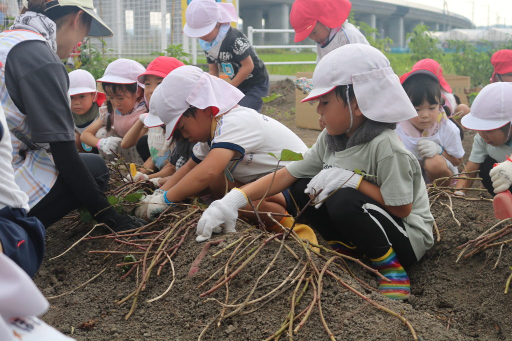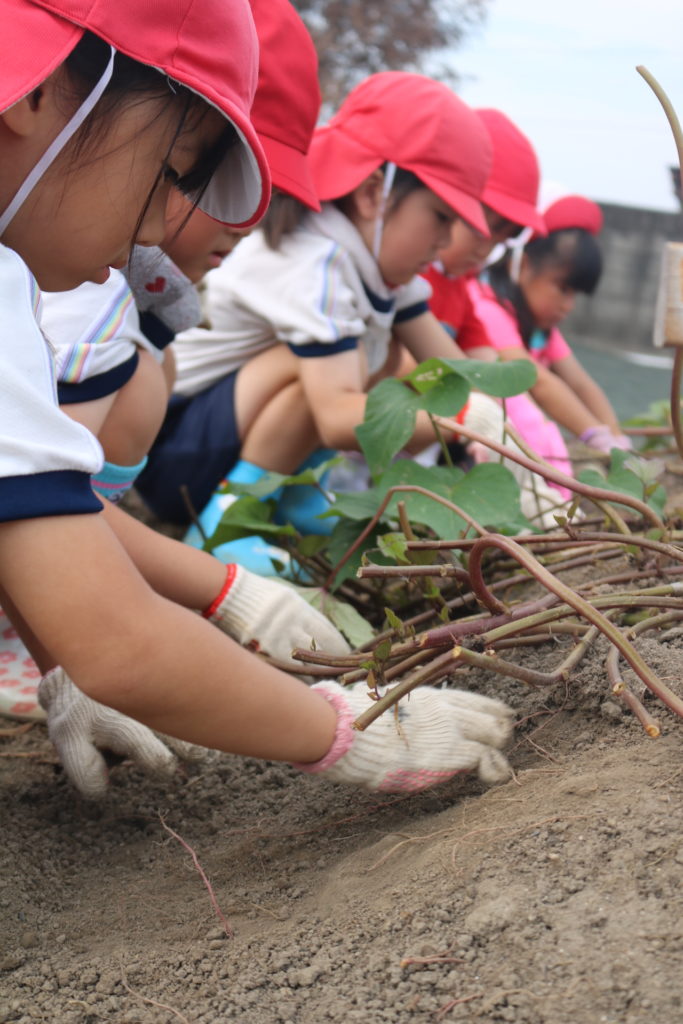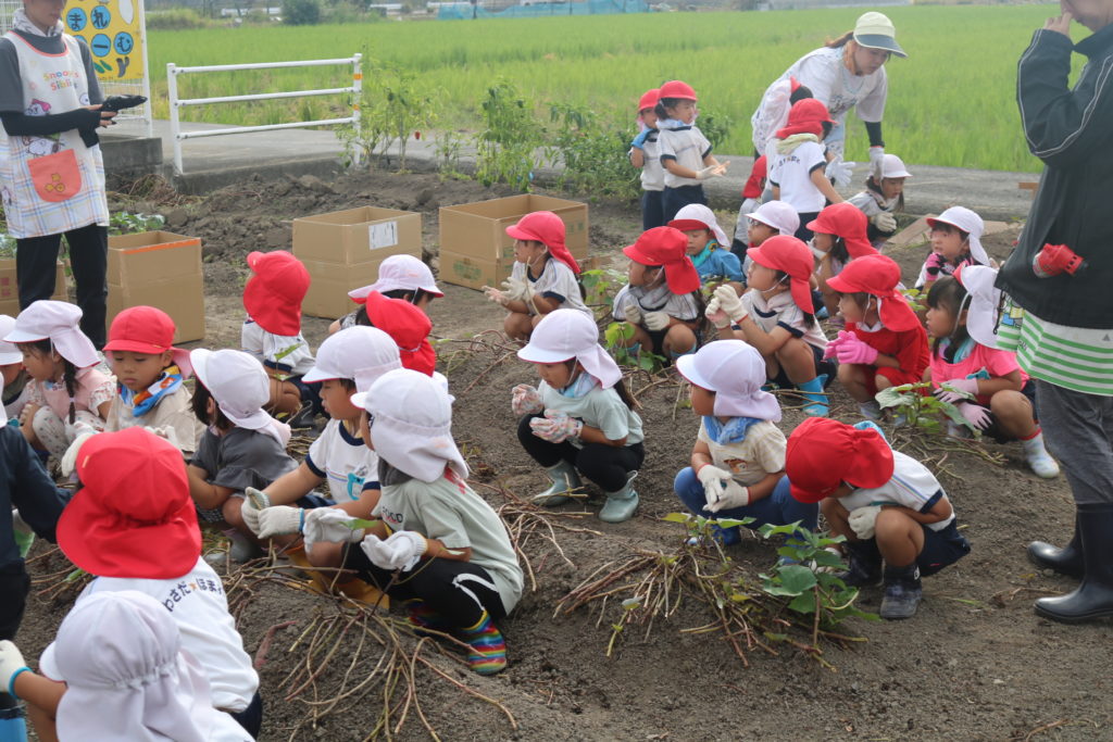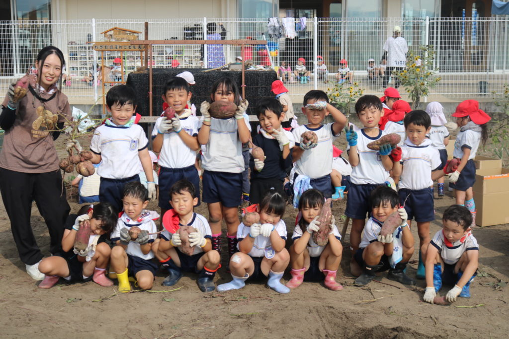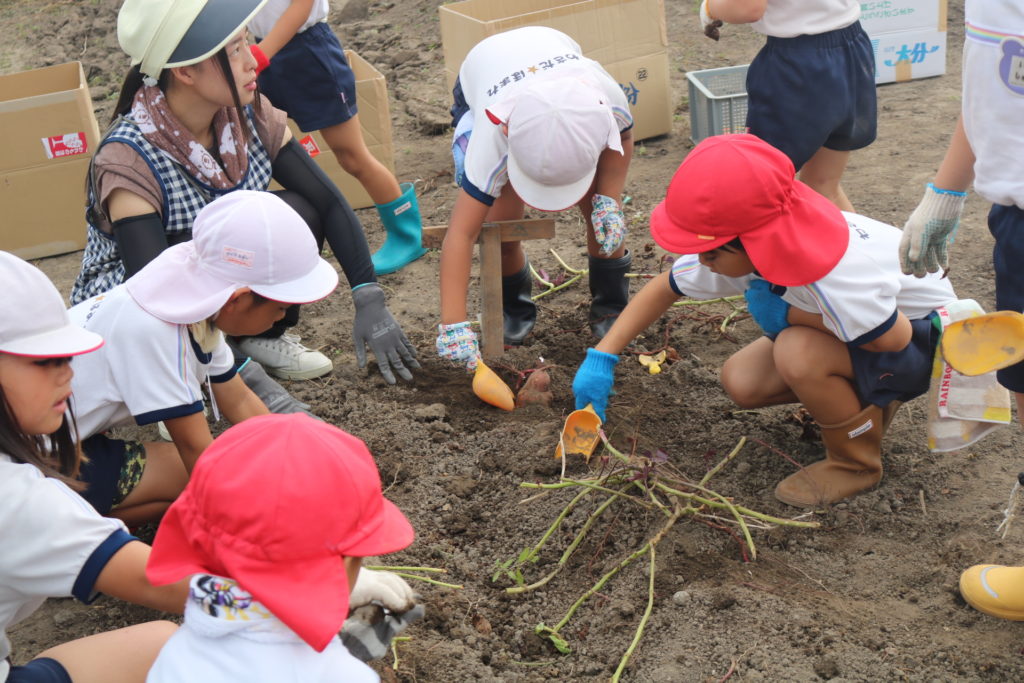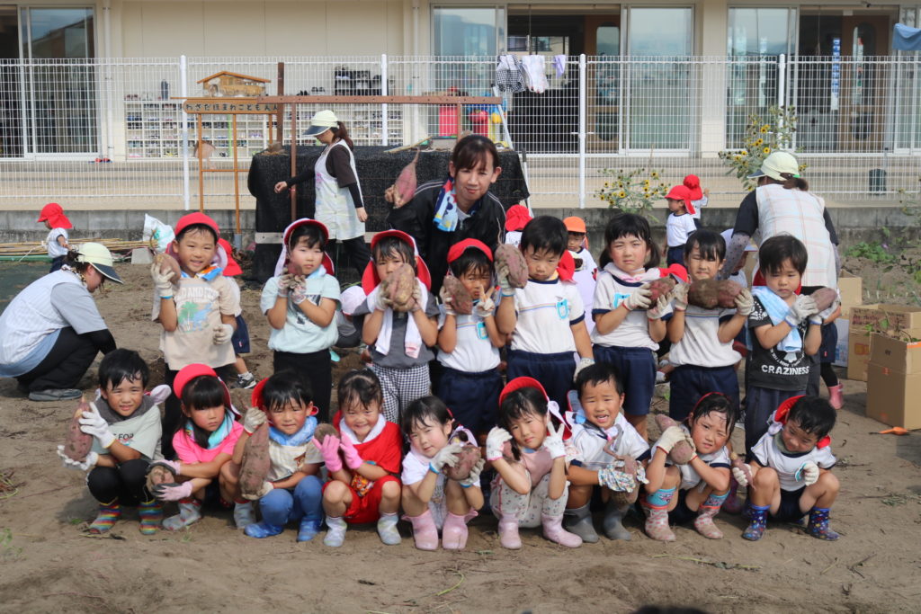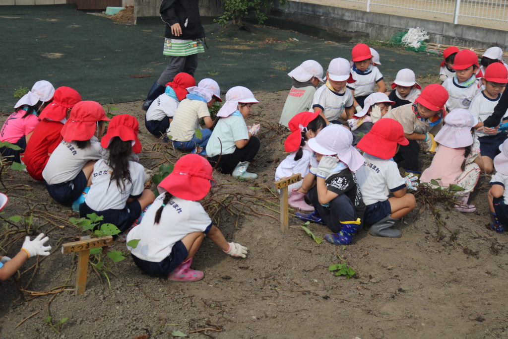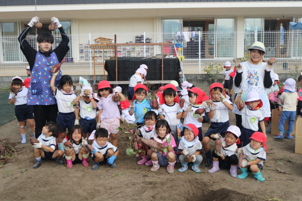 大きいお芋が沢山採れるかな??っとお芋掘りにワクワクしている子ども達で、掘り始めると夢中になってお芋を探し、掘り起こしていました。大きなお芋が採れると、先生やお友達に嬉しそうに見せたり、大きいお芋が採れた喜びを笑顔一杯で伝えてくれていました。小さいお芋、大きいお芋が沢山採れて楽しいお芋掘りが出来ました。採れたお芋でおやつを作ったりして、食育活動に繋げ皆で美味しく頂きたいと思います。