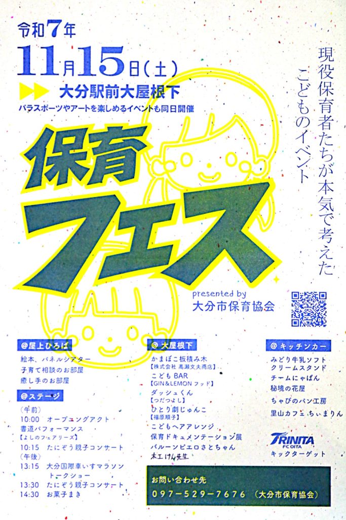 駅前広場に子ども達が遊べるブースやステージでの催し、屋上では絵本の読み聞かせやパネルシアター、子育て相談など、親子で楽しめるイベントとなっています。また、キッチンカーやトリニータさんのブースも出ています!保育ドキュメンテーション展もあり親子で楽しみながらも保育の魅力もお伝えできるイベントになっています。是非、11月15日(土)は大分駅前大屋下に遊びに来て下さい。イベント最後にはお菓子まきもあるよ♥お待ちしております!
