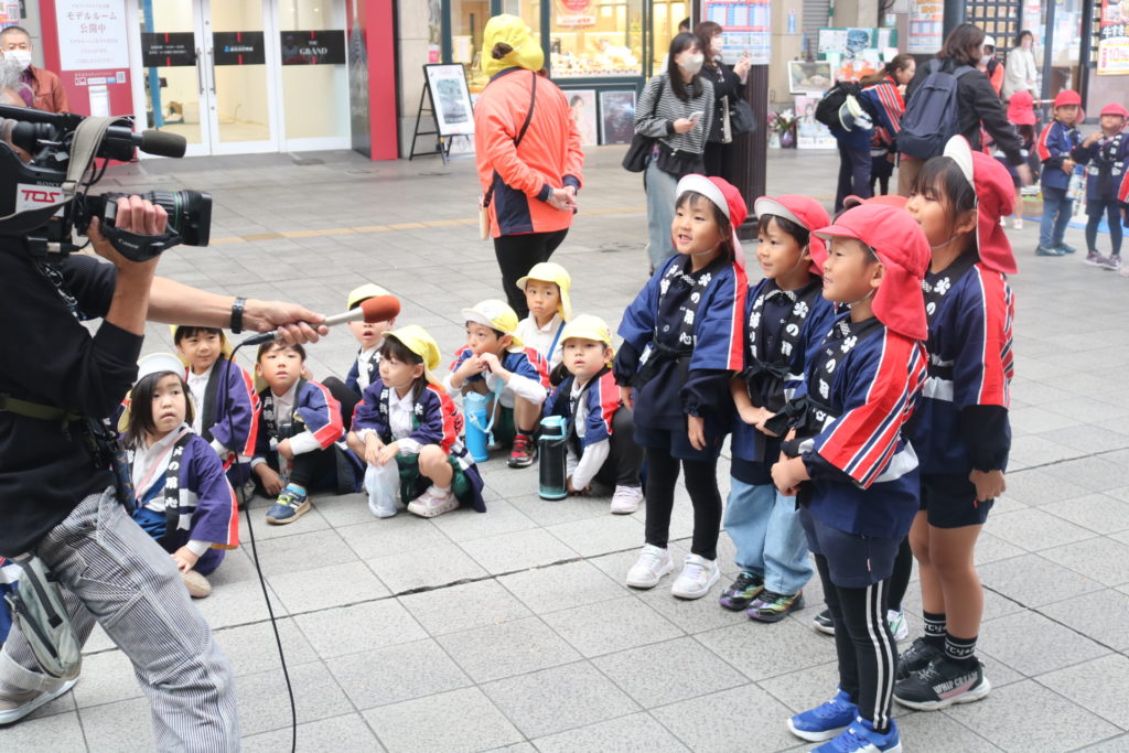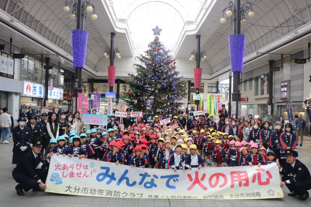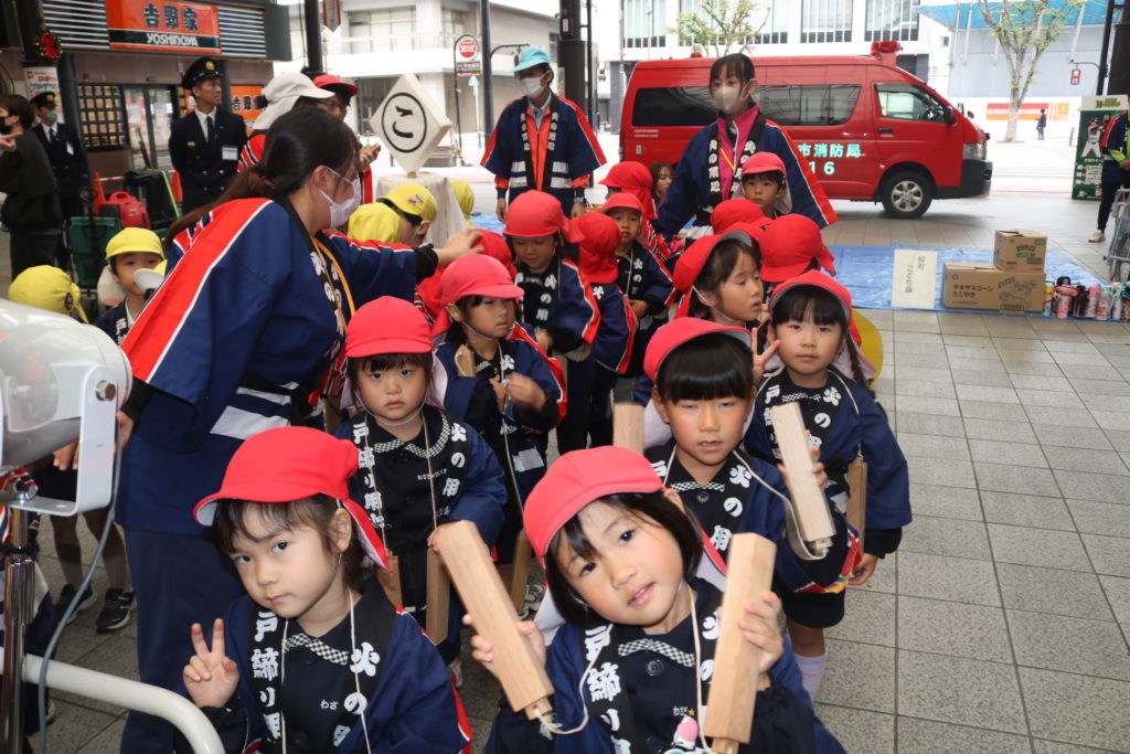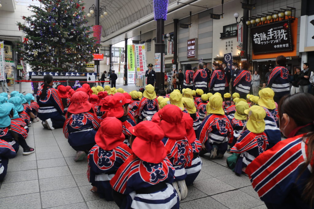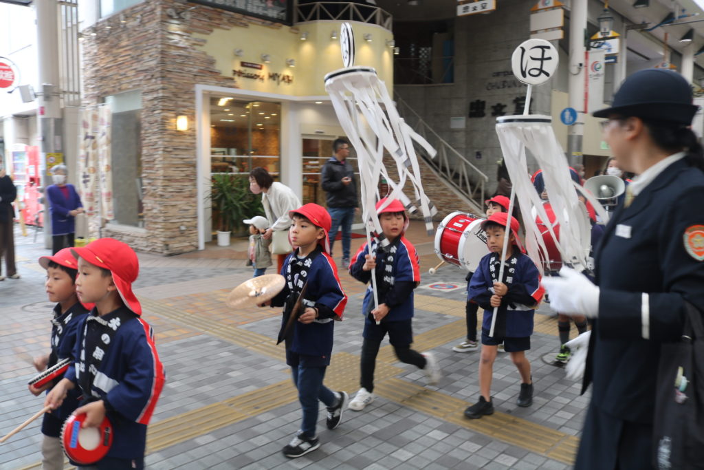 大型バスに乗って!年中さん、年長さんが防火パレードに行って来ました!!大分の町、竹町商店街の中を鼓笛でパレードしながら火災予防や火の取り扱いに気を付ける事を呼びかけていきました。年長さんは、太鼓や大太鼓、シンバルン、まといなどを上手に振りながら、年中さんは拍子木を叩きながら、大きな声で「火の用心」と呼びかけてまわりました。子ども達のこういった活動で少しでも火災の予防に繋がってくれると嬉しく思います。テレビ取材も受けており、可愛く受け答えをしていた年長さんです。日頃の保育の中でも、こういったお話をし、災害、防災などの意識を高めていきたいと思います。